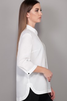 Стильная рубашка свободного покроя с рубашечным воротником. Подрезная кокетка переходит с полочки на спинку. На спинке от уровня кокетки обработана встречная складка. В боковых швах расположены фигурные разрезы. Рукав 7/8 прямой, втачной с манжетой на застёжку. Планка декорирована пришивной лентой. Низ блузки рельефный, обтачной и отстрочен отделочным швом.