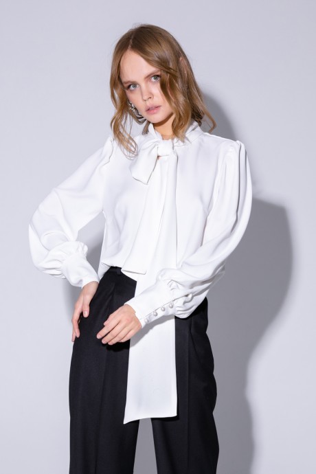 Блуза из текстильной струящейся ткани с воротником-аскот. Детали: прямой силуэт, нагрудные вытачки, рукава длинные объемные со сборкой и высокими притачными манжетами, без застежки.