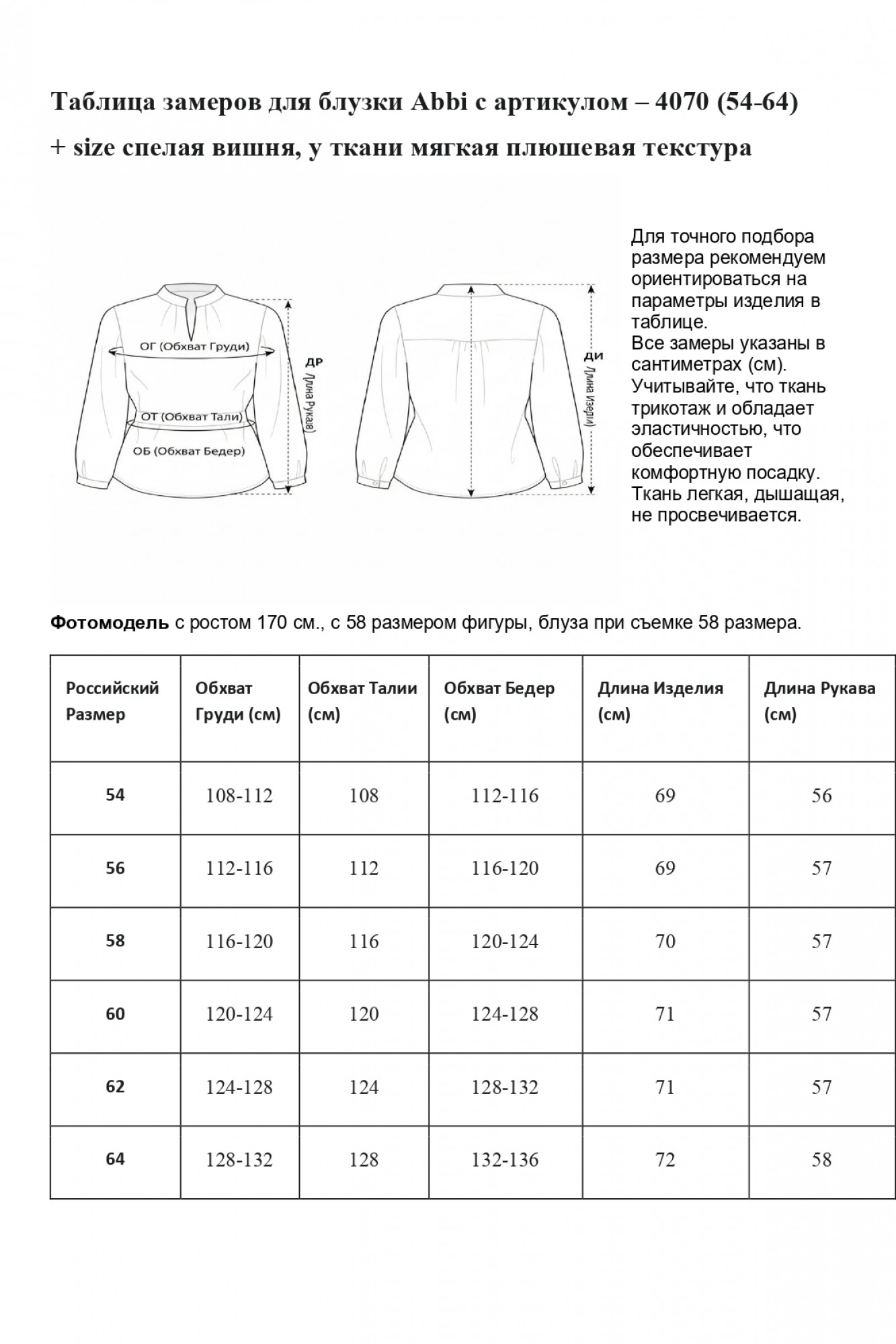 На модели — размер блузки - 58, рост фотомодели - 170 см. Размерный российский ряд: 54–64.