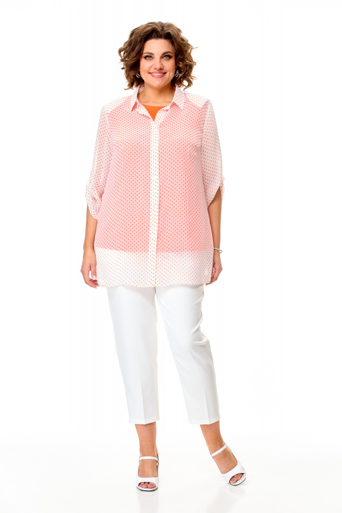 Ткань – легкий воздушный дышащий шифон, просвечивается, с принтом в красивые оранжевые горохи.