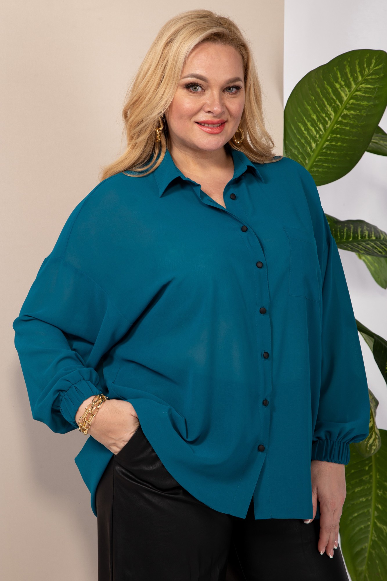 Блузка женская, прямого силуэта, из шифоновой ткани со спущенным плечом. Застежка модели на планку и пуговицы, воротник на стойке, по полочке идет накладной карман, манжет рукава на резинке. Длина (по спинке): (46-50)-72см., (52-56)-74см., (58-62)-75см. Длина рукава (с манжетой): (46-62)-50см.