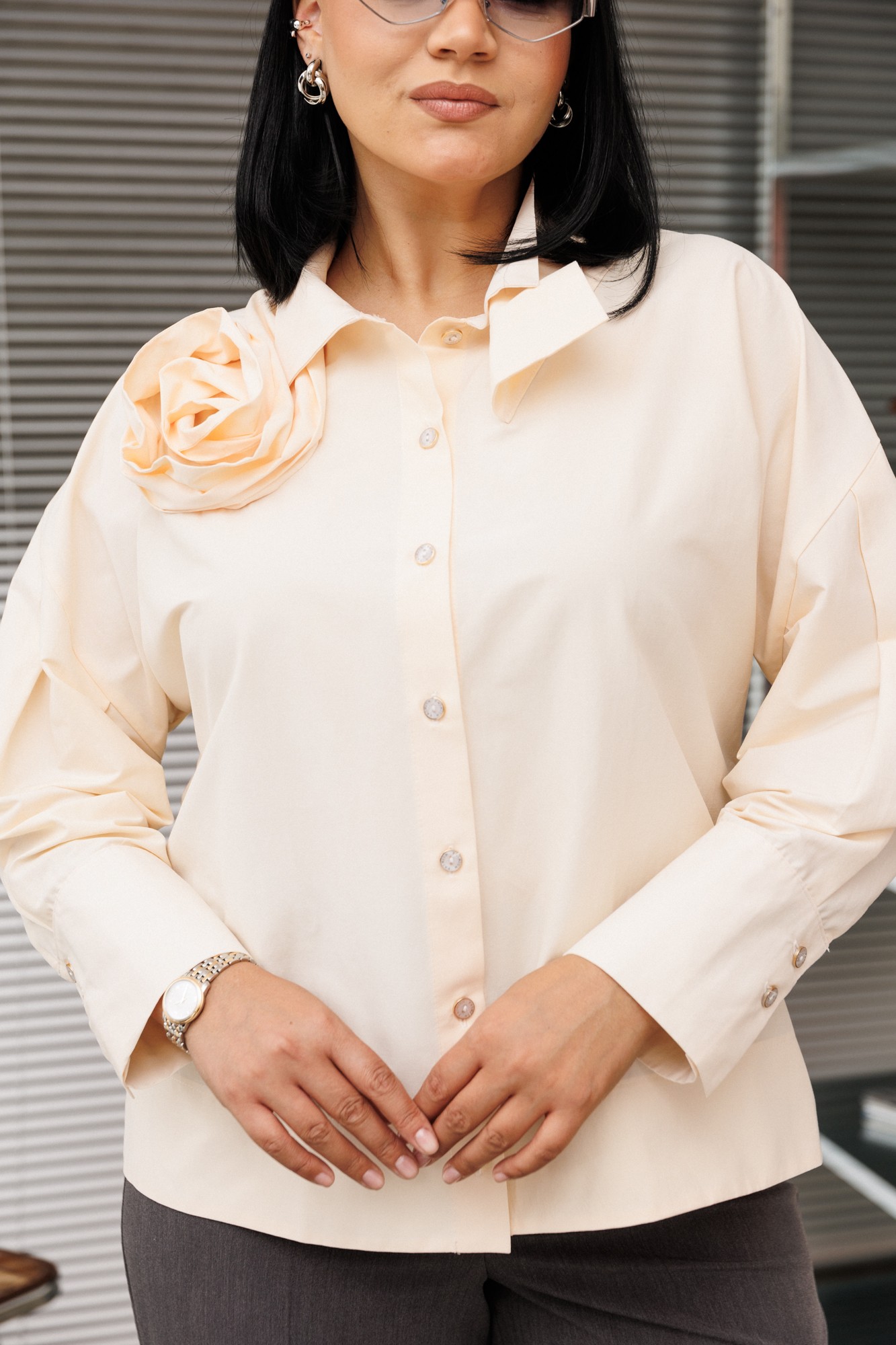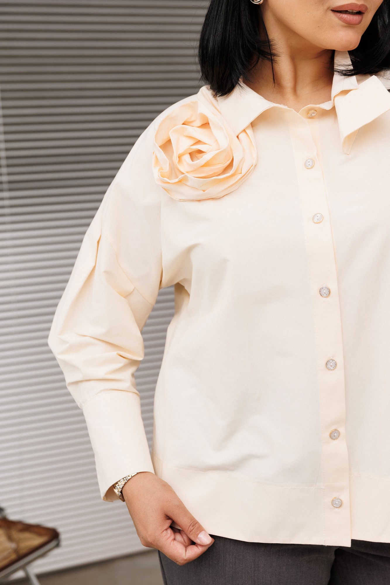Блузка женская с акцентным декором полуприлегающего силуэта. Рукав "летучая мышь" с подрезом по линии проймы и односторонними складками и манжетой. Застежка- планка на петли и пуговицы. Воротник стояче-отложной. В качестве декора - дополнительный воротник, плавно переходящий в цветок. Благодаря своему крою станет базовой вещью в вашем гардеробе. Легко сочетается с любыми брюками, юбками, платьями и джинсами. Позволит создать большое количество образов для офиса, прогулок, праздничных мероприятий.