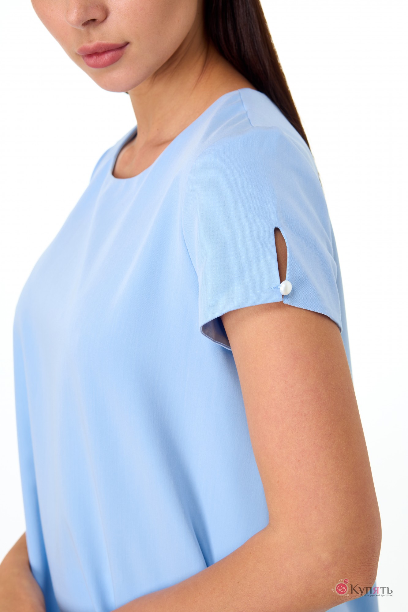 Округлый вырез горловины,короткий втачной рукав с прорежкой и застежкой на пуговку.В средне шве спинки удлинённый вырез с застежкой на пуговицу.