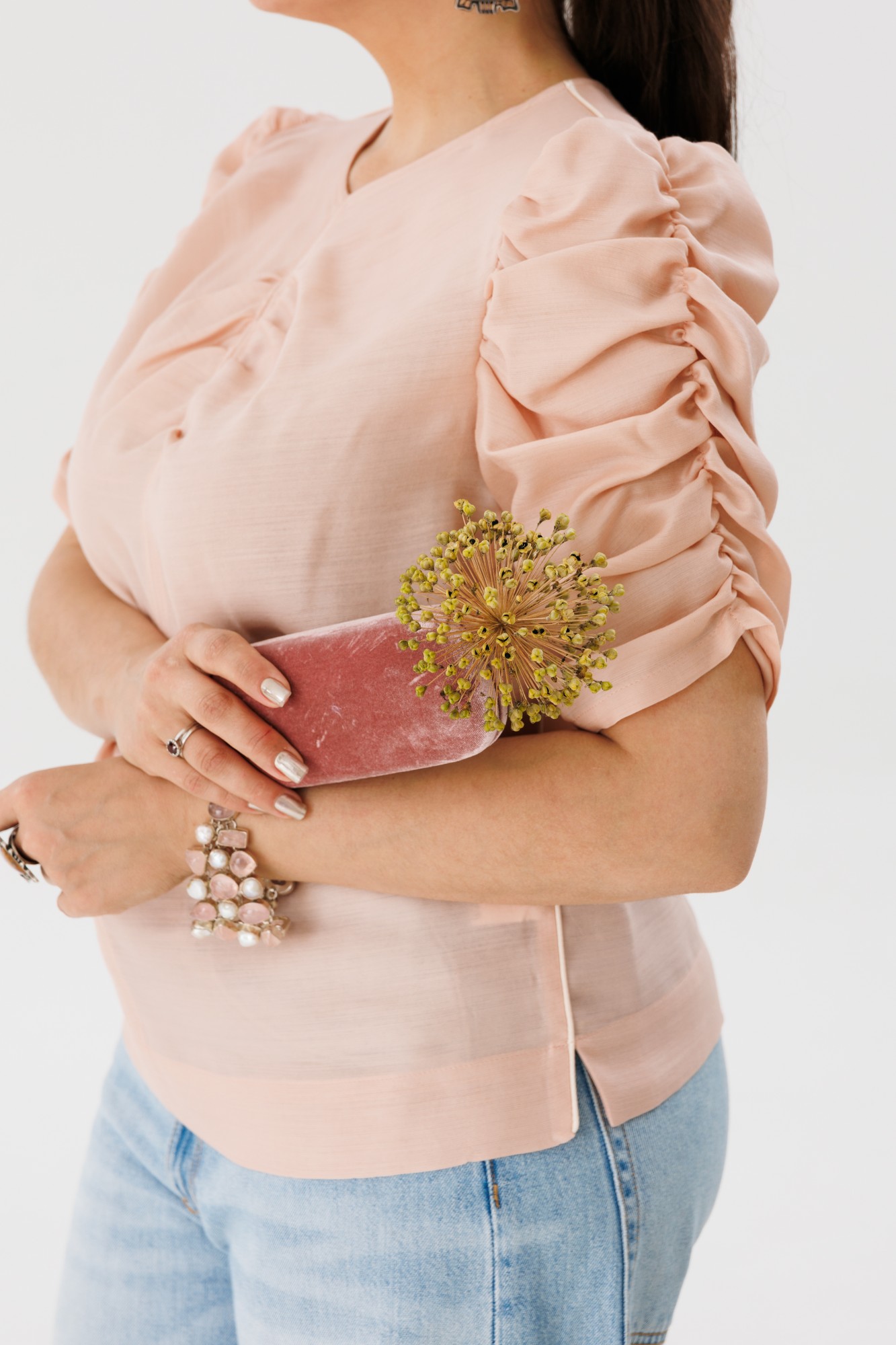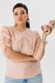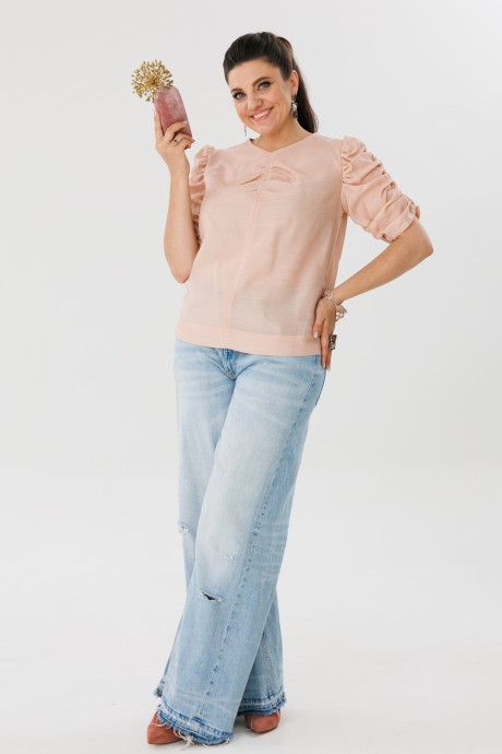 Блуза выполнена в нежном рассветном оттенке, а изящные сборки подчеркивают хрупкость и аристократичность образа.