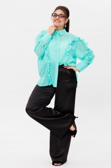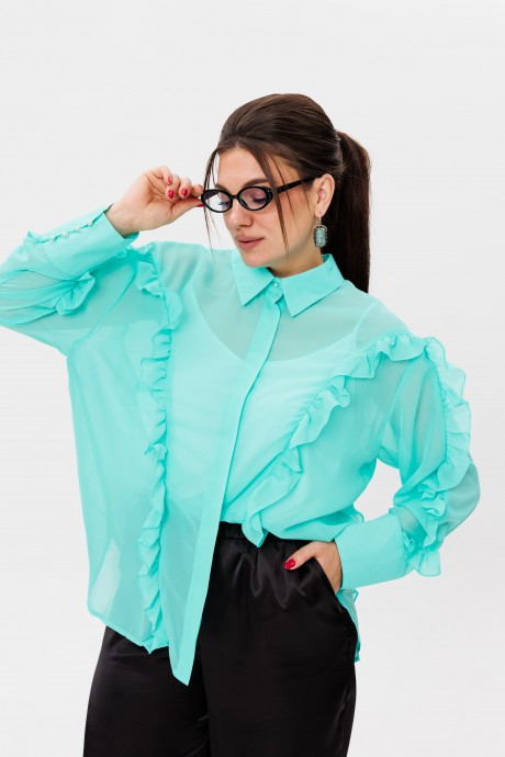 Фигурный низ, достигающий середины бедра, добавляет динамики и оригинальности, а длинные рукава с зауженными манжетами подчеркивают стильный силуэт. Декоративные рюши по всей длине рукава добавляют нотку игривости и женственности. Классический рубашечный воротник на стойке завершает образ, придавая ему элегантность.