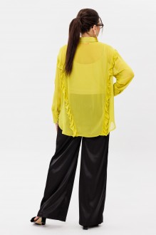 Фигурный низ, достигающий середины бедра, добавляет динамики и оригинальности, а длинные рукава с зауженными манжетами подчеркивают стильный силуэт. Декоративные рюши по всей длине рукава добавляют нотку игривости и женственности. Классический рубашечный воротник на стойке завершает образ, придавая ему элегантность.