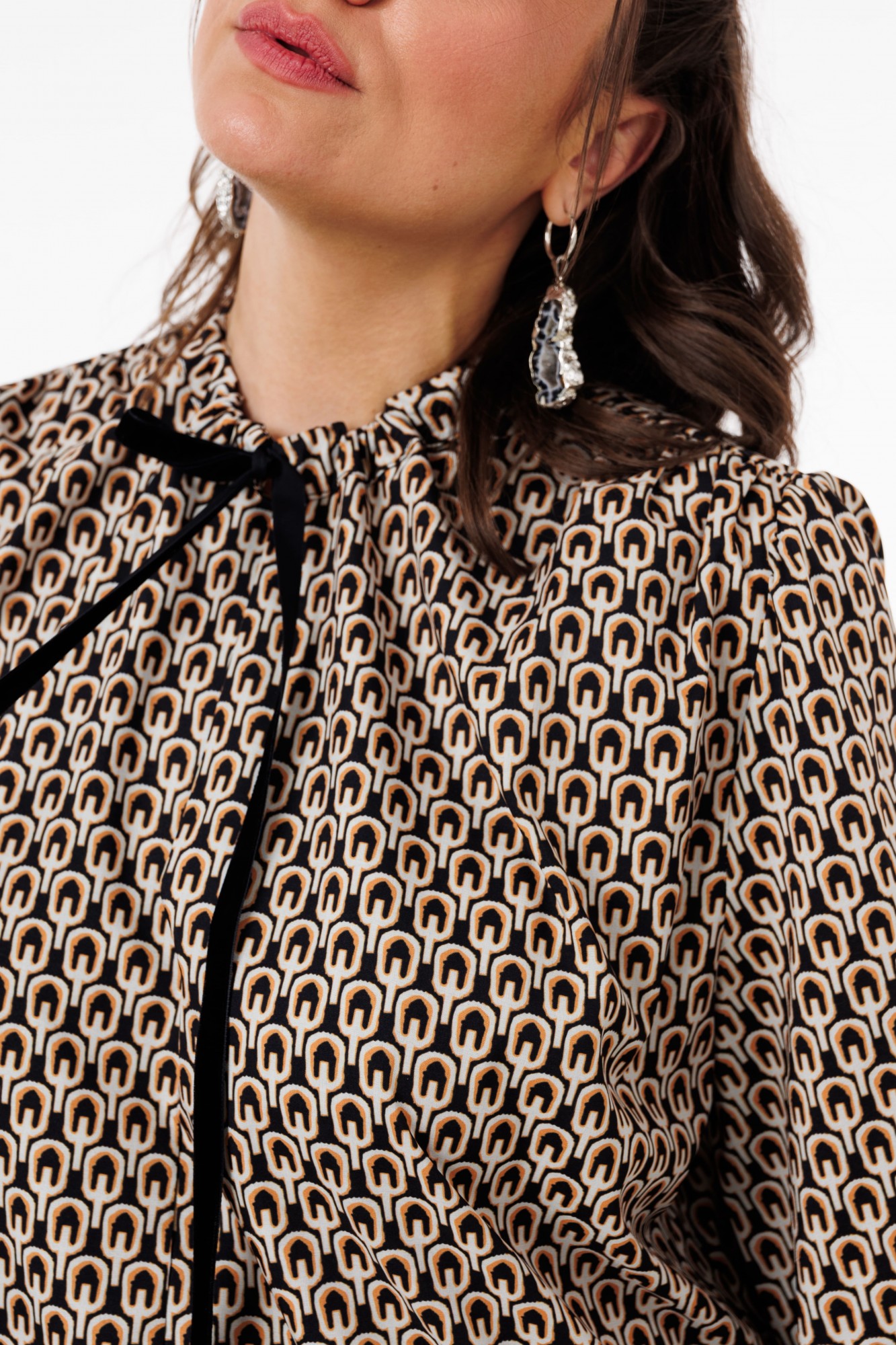 Длинные втачные рукава свободного кроя украшены сборкой по низу и декоративными завязками, добавляя нотку игривости и оригинальности. Воротник-стойка, отделанный бархатной тесьмой, придает блузе особый шарм и утонченность.