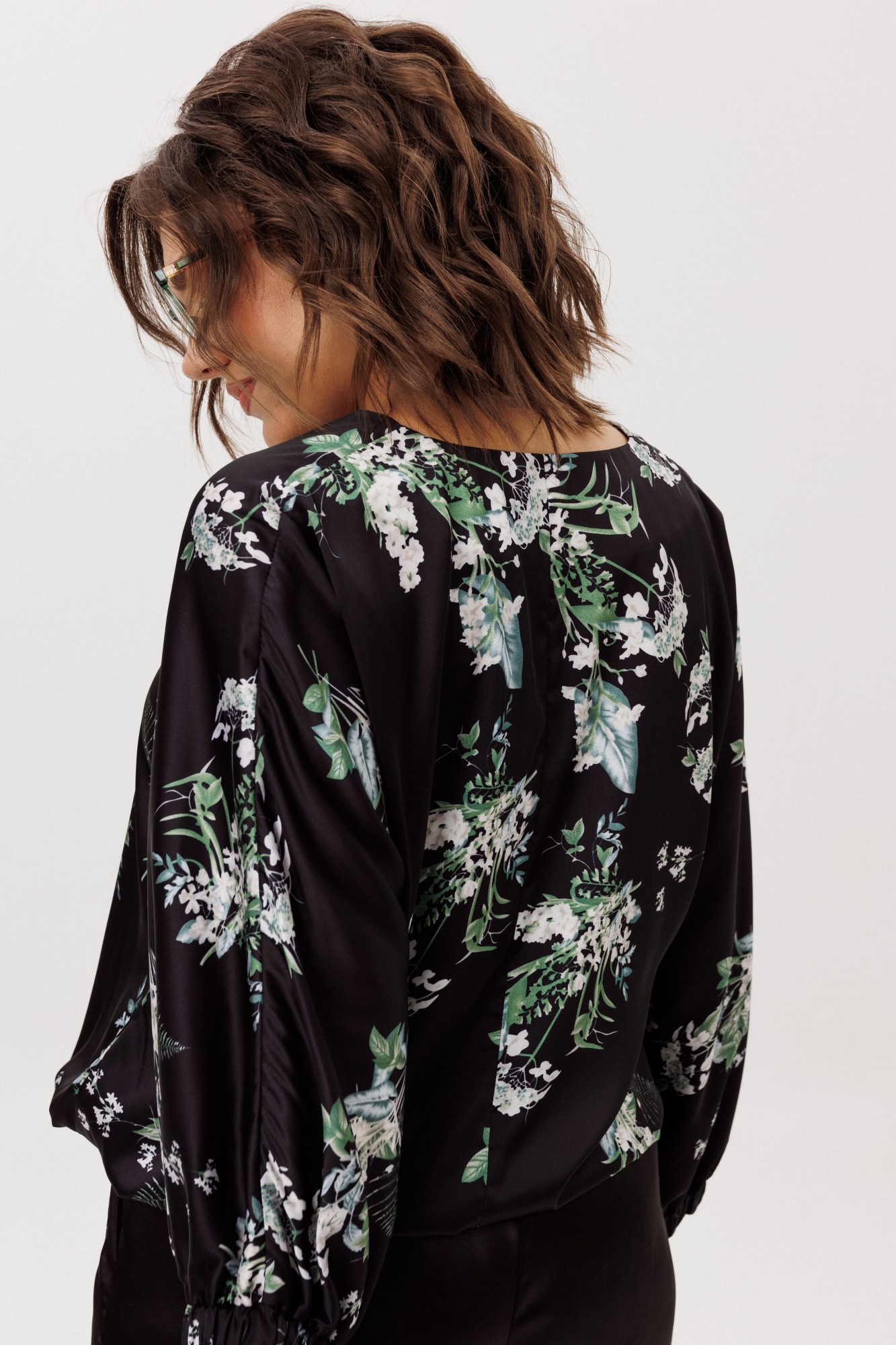 Особую динамику и индивидуальность блузе придают детали: цельнокроеные рукава три четверти подчёркивают целостность и плавность линий, а притачной пояс и манжеты, собранные в нежную сборку благодаря эластичной резинке, создают выразительный контраст с текучестью основной ткани. Эта умная конструкция позволяет вам самостоятельно регулировать длину блузы, творчески преобразуя её силуэт — от парящего и расслабленного до более собранного и чёткого.