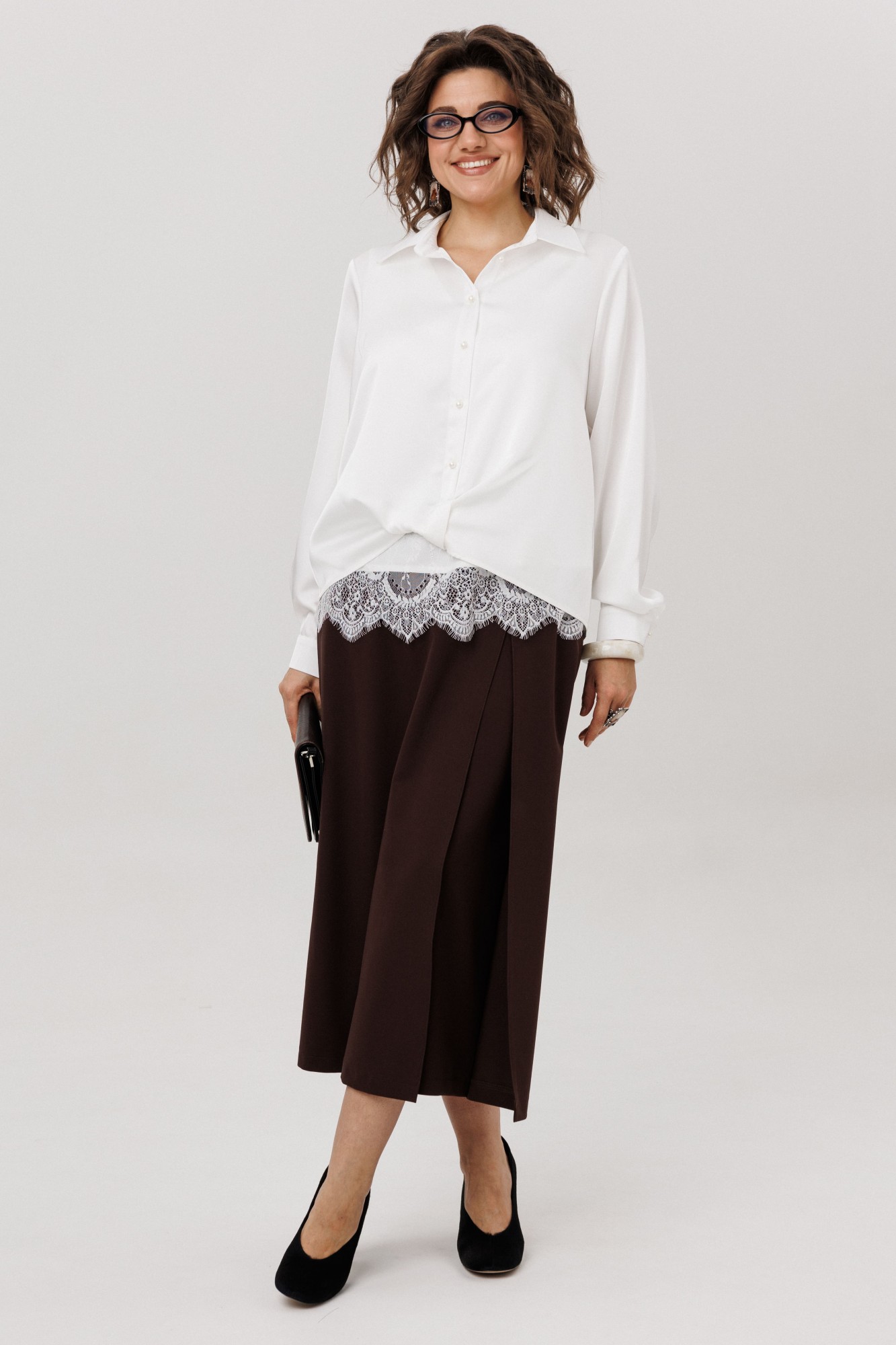 На модели в рубашке цвета «перламутровая жемчужина» топ 1664, юбка-брюки 1783 и атласная юбка 1808.