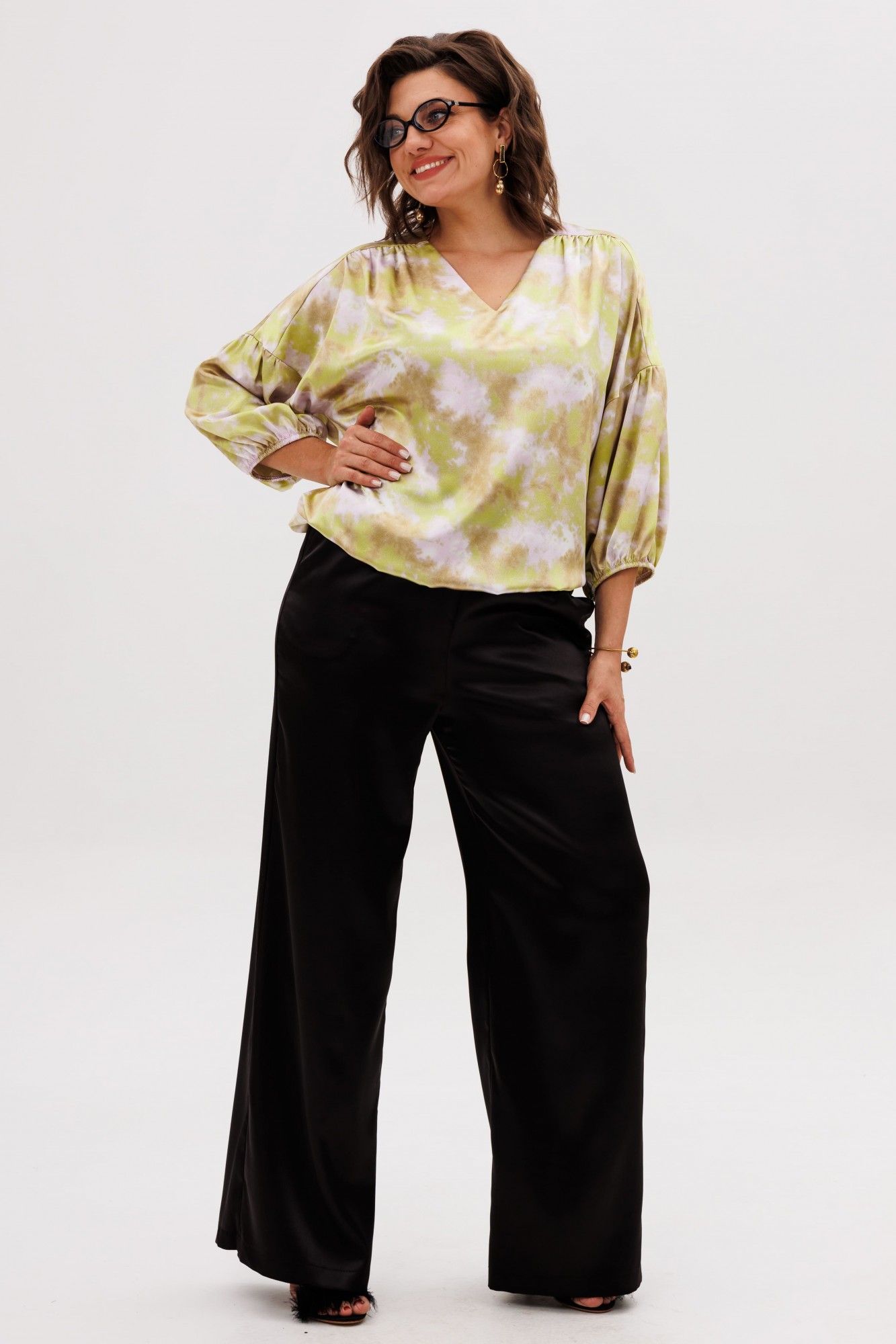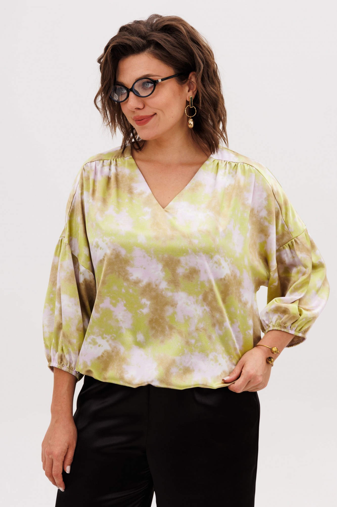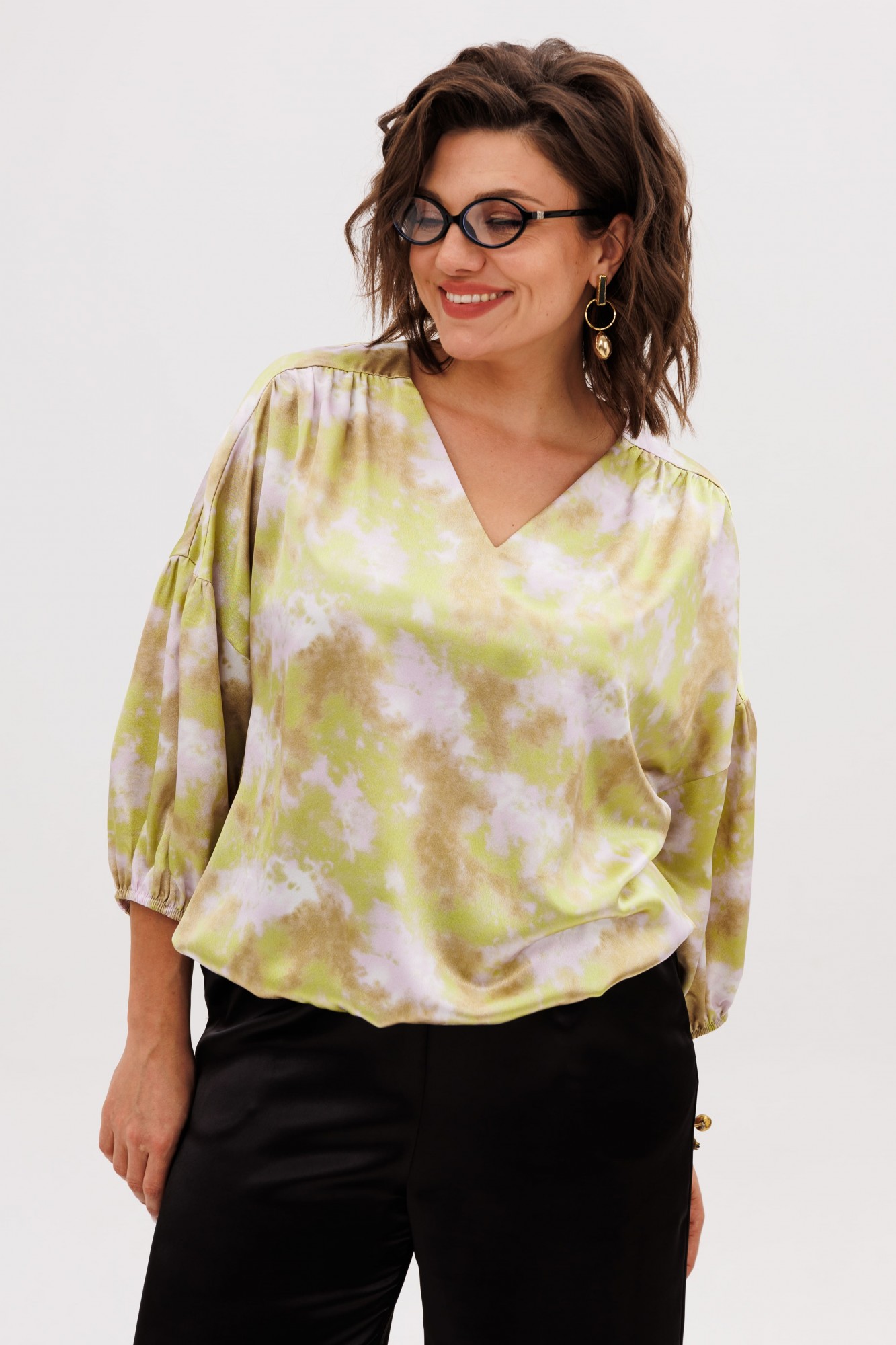 Ее свободный крой и мягкие спущенные плечи создают основу для невесомого силуэта. Глубокий V-образный вырез придает образу изысканность, а изящная кокетка добавляет художественный штрих. Рукав-кимано, собранный на резинке, мягко облегает запястье, предлагая вам варьировать его длину.