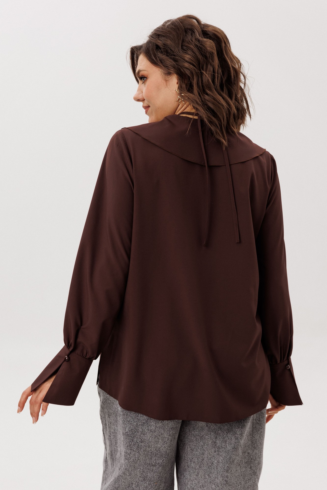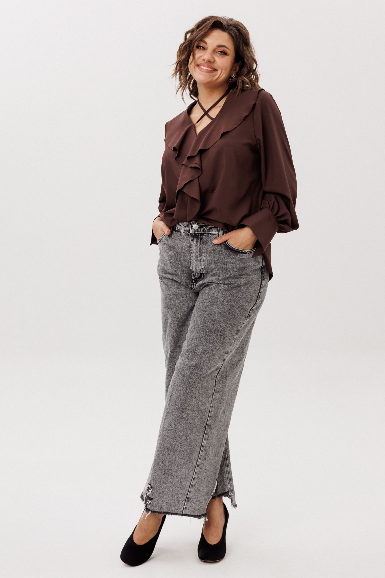 Эта блуза от Анелли — воплощение нежной романтики и воздушной лёгкости. Её прямой свободный крой струится мягкими складками, создавая изящный и непринуждённый силуэт, а лёгкая воздушность ткани придаёт образу пленительную невесомость. Глубокий V-образный вырез, украшенный воланами, подчеркивает изысканно-романтичный характер блузы. Эту историю дополняет игра завязок: их можно распустить для непринуждённой элегантности или завязать на шее, чтобы подчеркнуть трогательную женственность. Мягкие сборки на длинных рукавах, переходящие в аккуратные манжеты, и лёгкие разлетающиеся разрезы по бокам завершают картину, делая каждый жест и каждое движение частью изящного и мечтательного стиля. На модели брюки 1702.