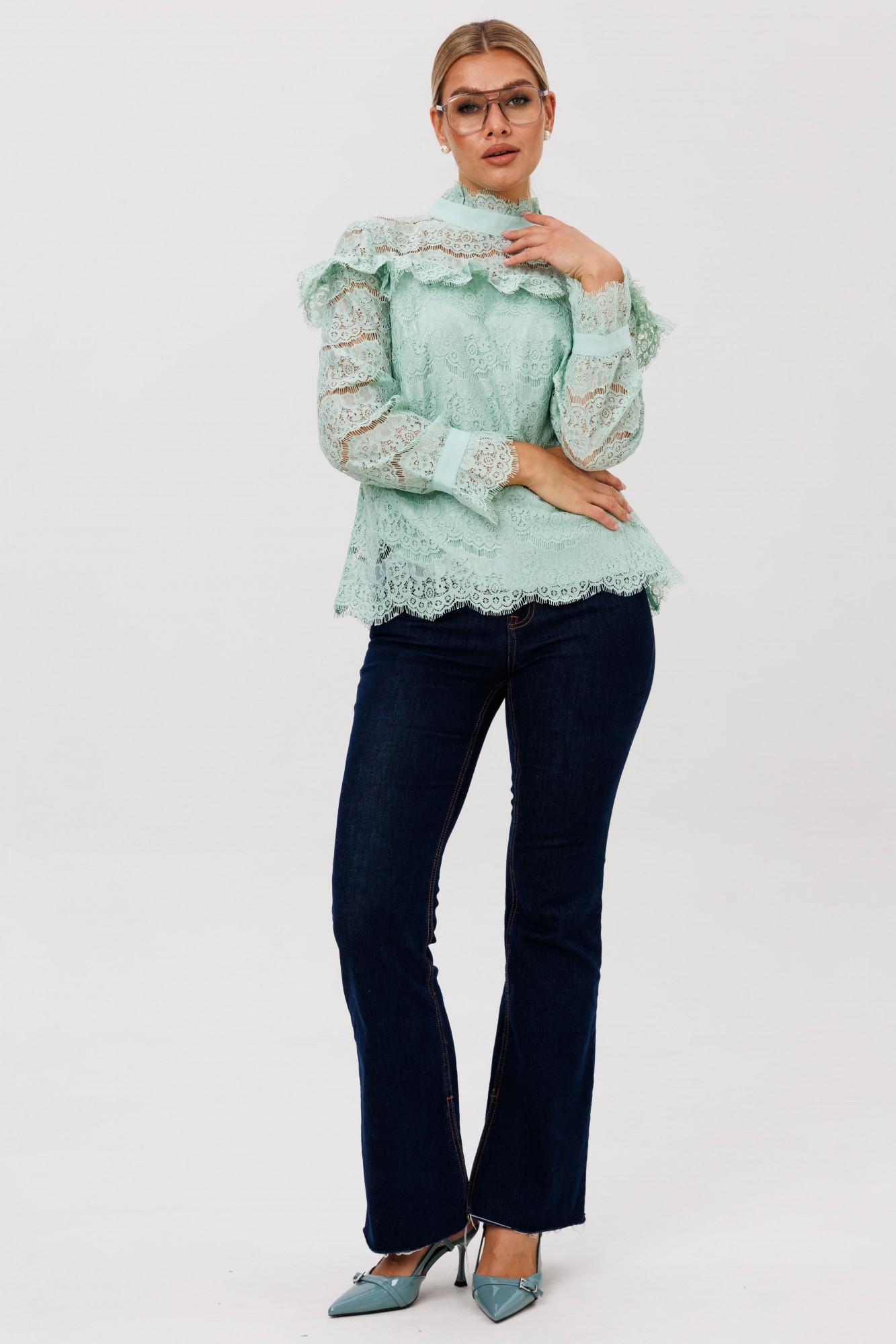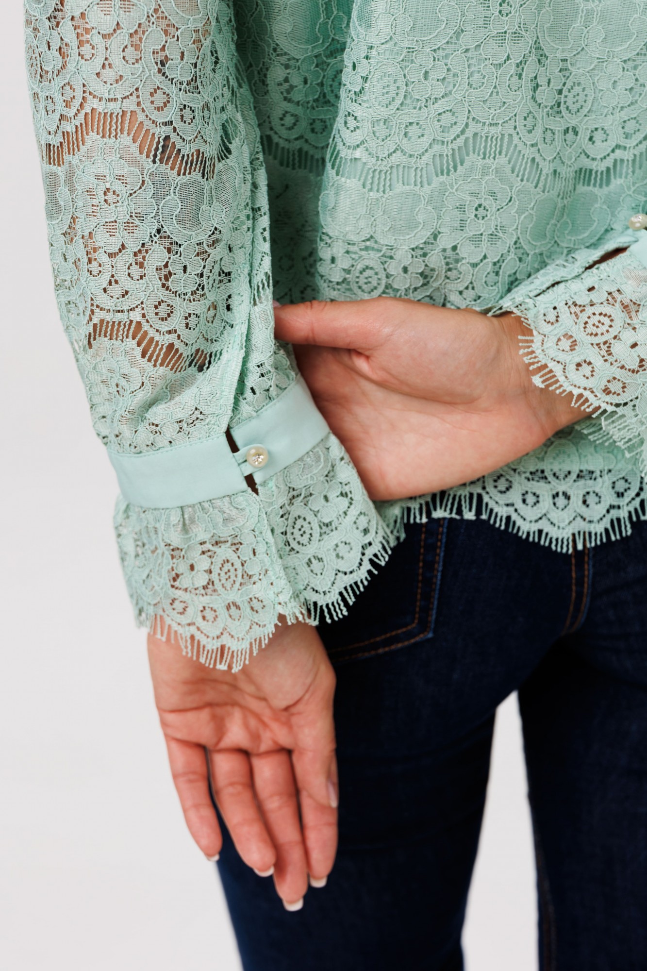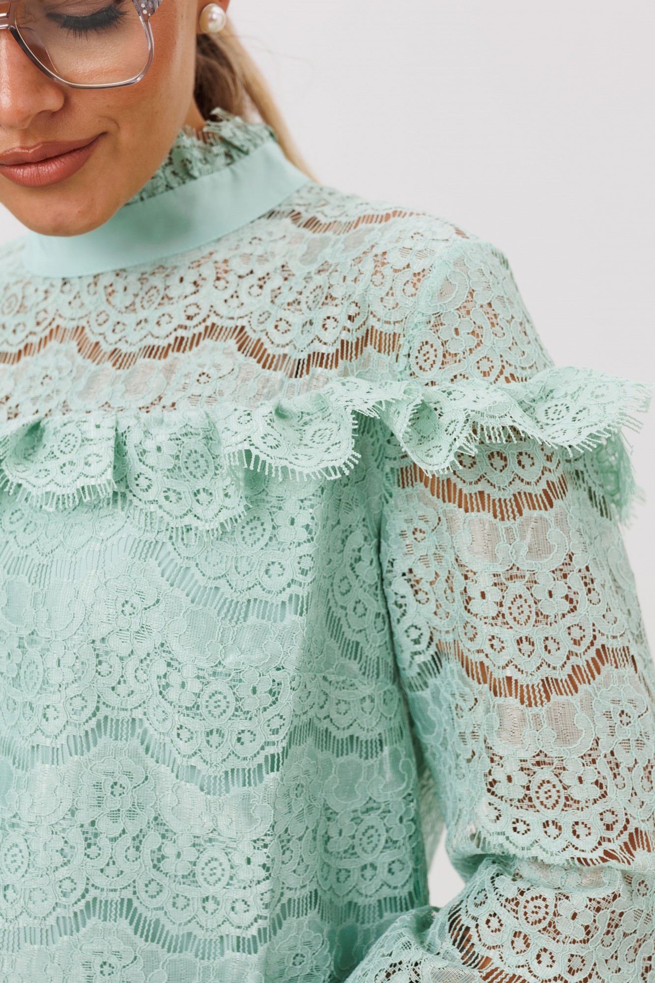 Кокетливая блуза с нотками романтизма выполнена из плотного кружевного полотна. Её прямой силуэт украшен изысканными конструкторскими деталями: отрезные кокетки по переду и спинке мягко подчеркнуты воланом, а воротник-стойка и королевские манжеты на рукавах декорированы ажурной кружевной отделкой. Застёжка на пуговицы, расположенная по задней стойке, добавляет модели особый шарм.