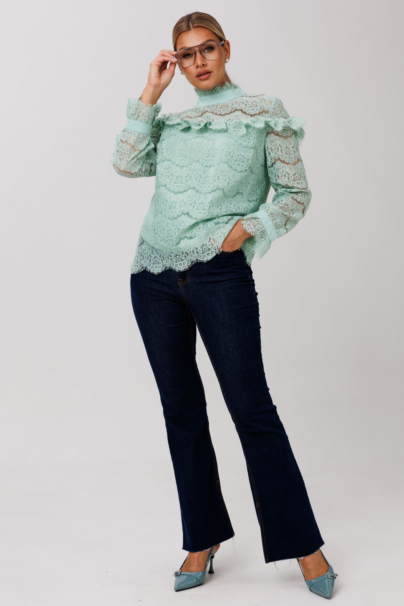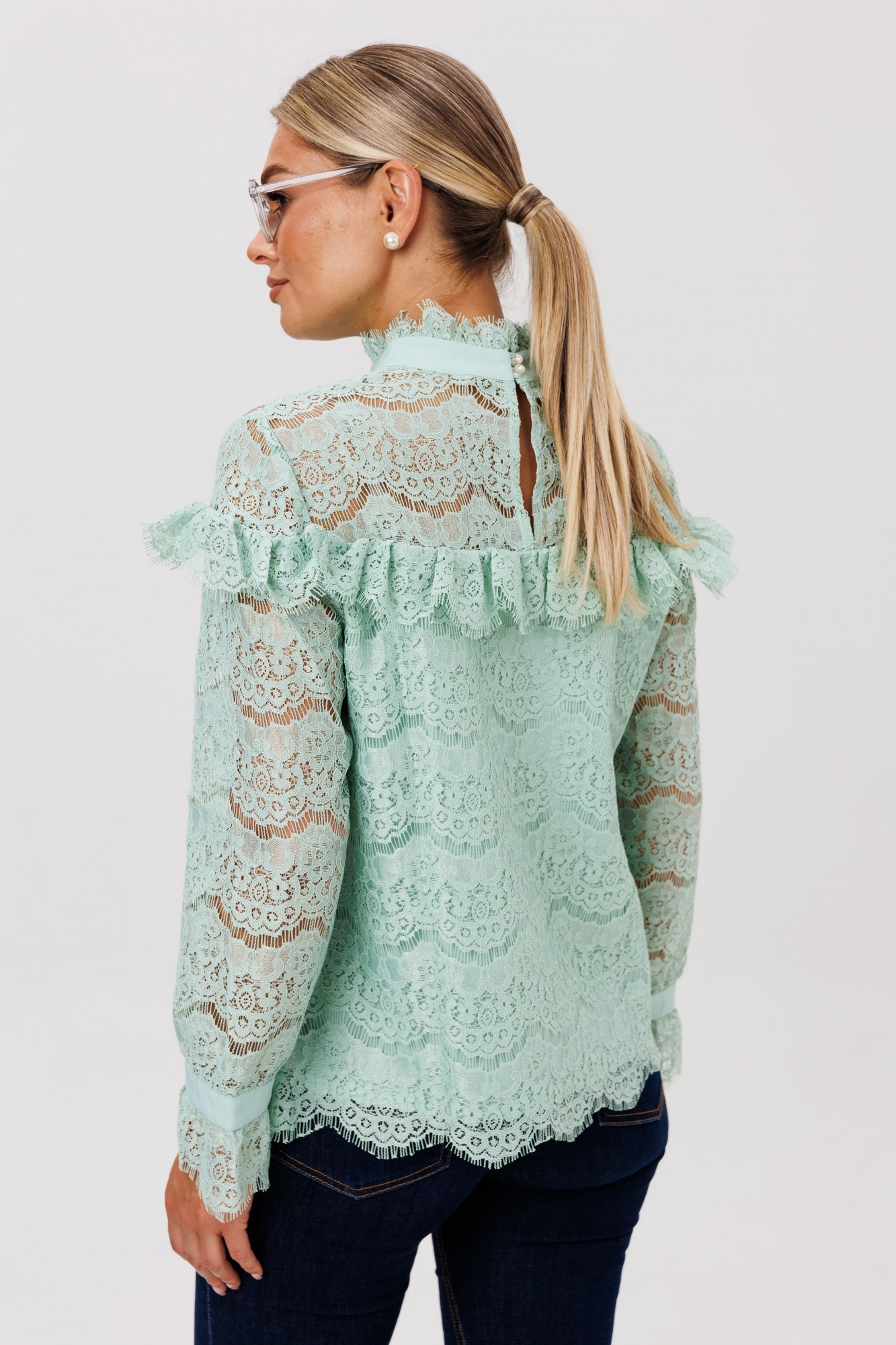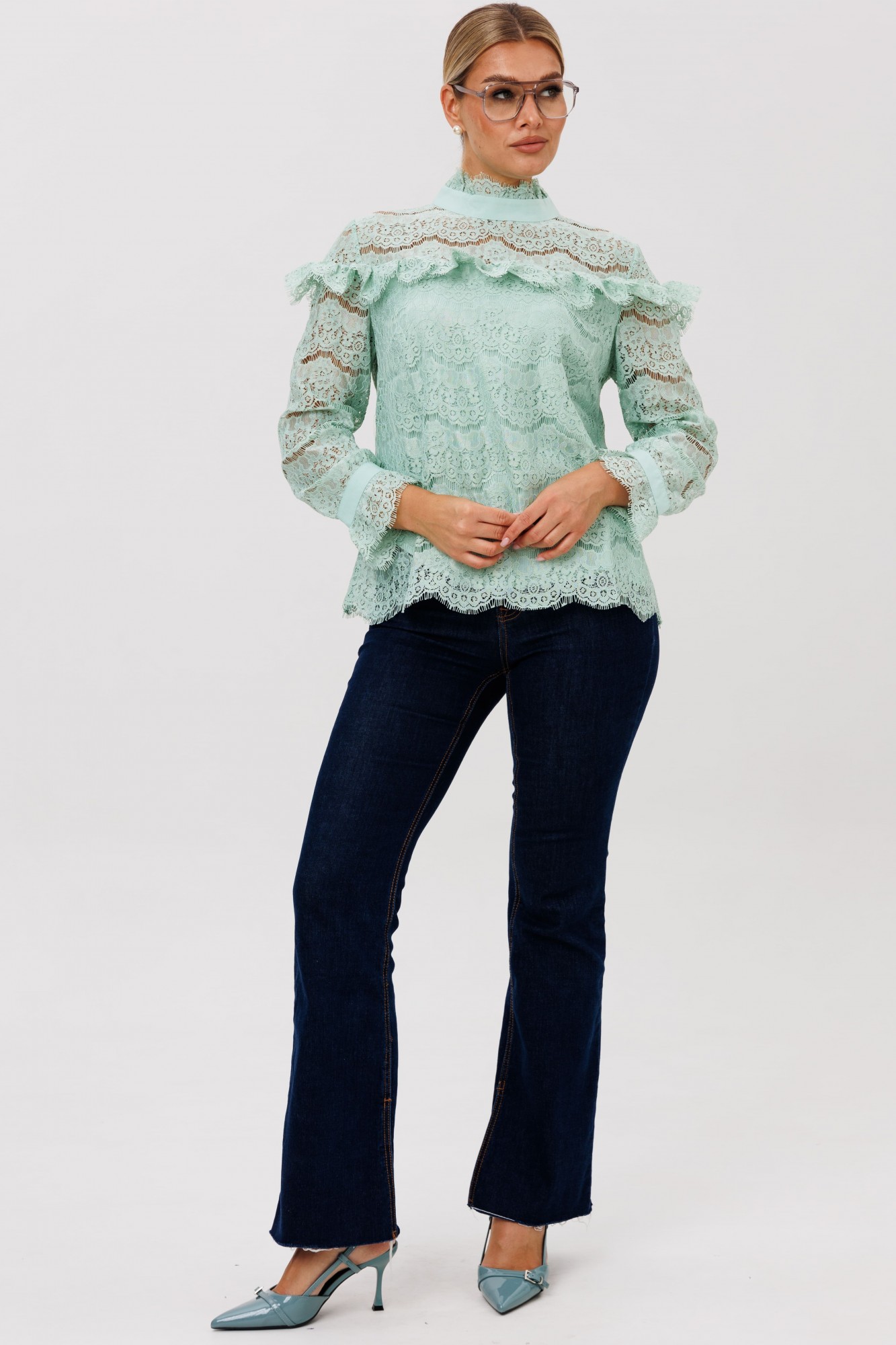 Кокетливая блуза с нотками романтизма выполнена из плотного кружевного полотна. Её прямой силуэт украшен изысканными конструкторскими деталями: отрезные кокетки по переду и спинке мягко подчеркнуты воланом, а воротник-стойка и королевские манжеты на рукавах декорированы ажурной кружевной отделкой. Застёжка на пуговицы, расположенная по задней стойке, добавляет модели особый шарм.