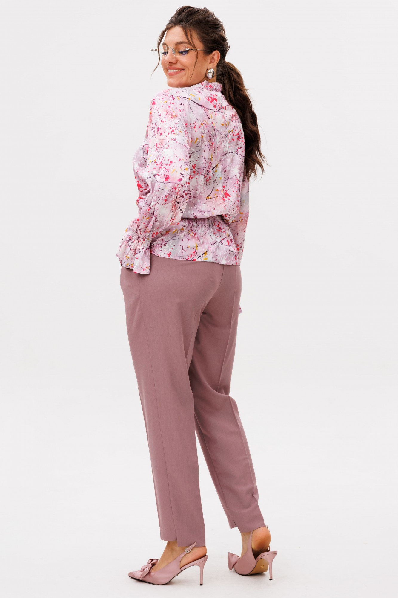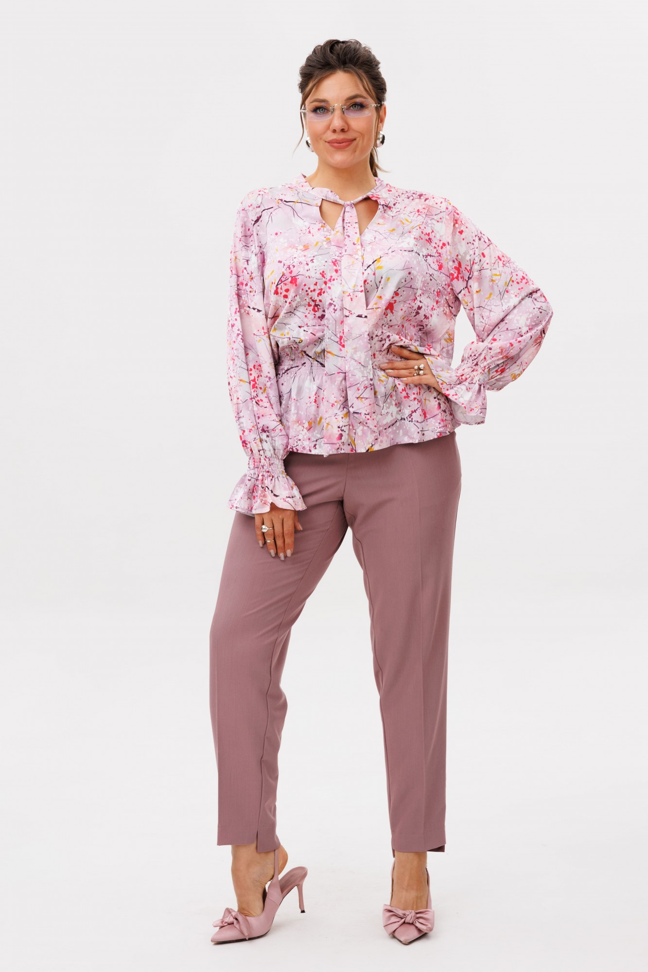 Эта блуза от Анелли изящно подчеркивает силуэт, оставаясь невероятно легкой и комфортной. Её свободный крой мягко следует за линиями тела, а элегантные сборки у талии создают утонченный объем и ощущение движения. Главный акцент — фигурный каплевидный вырез, обрамленный воротником-бантом. Завяжите его в нежный узел или отпустите концы для более непринужденного вида — вы создадите нужное настроение в мгновение ока. Мягкие линии плеч и свободные рукава, собранные на резинку на запястье, добавляют образу пластичности и утонченной небрежности. Детальная работа в виде отделки эластичной нитью подчеркивает современный ритм этой модели. Эта блуза станет выразительной, но такой естественной частью вашего гардероба соединяя повседневность и особые моменты. На модели в блузе цвета «фьюжен фуксия» брюки 1687. Рост модели 173 см, размер 52. Для того чтобы подобрать для себя идеальный размер, обязательно сверяйтесь с замерами в описании, мы их делаем индивидуально к каждому изделию. А если будут вопросы задавайте их менеджерам или пишите в отдел заботы.