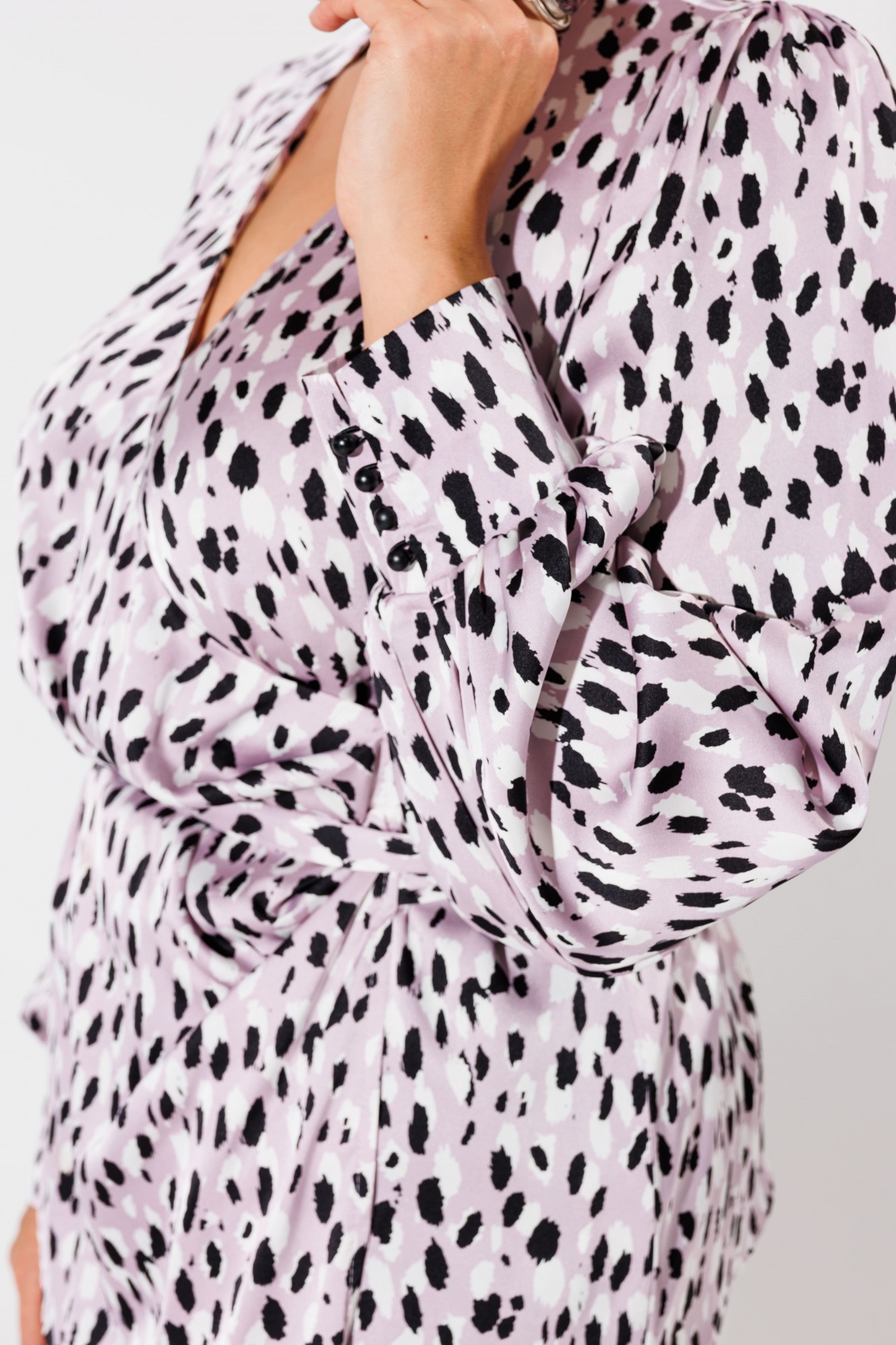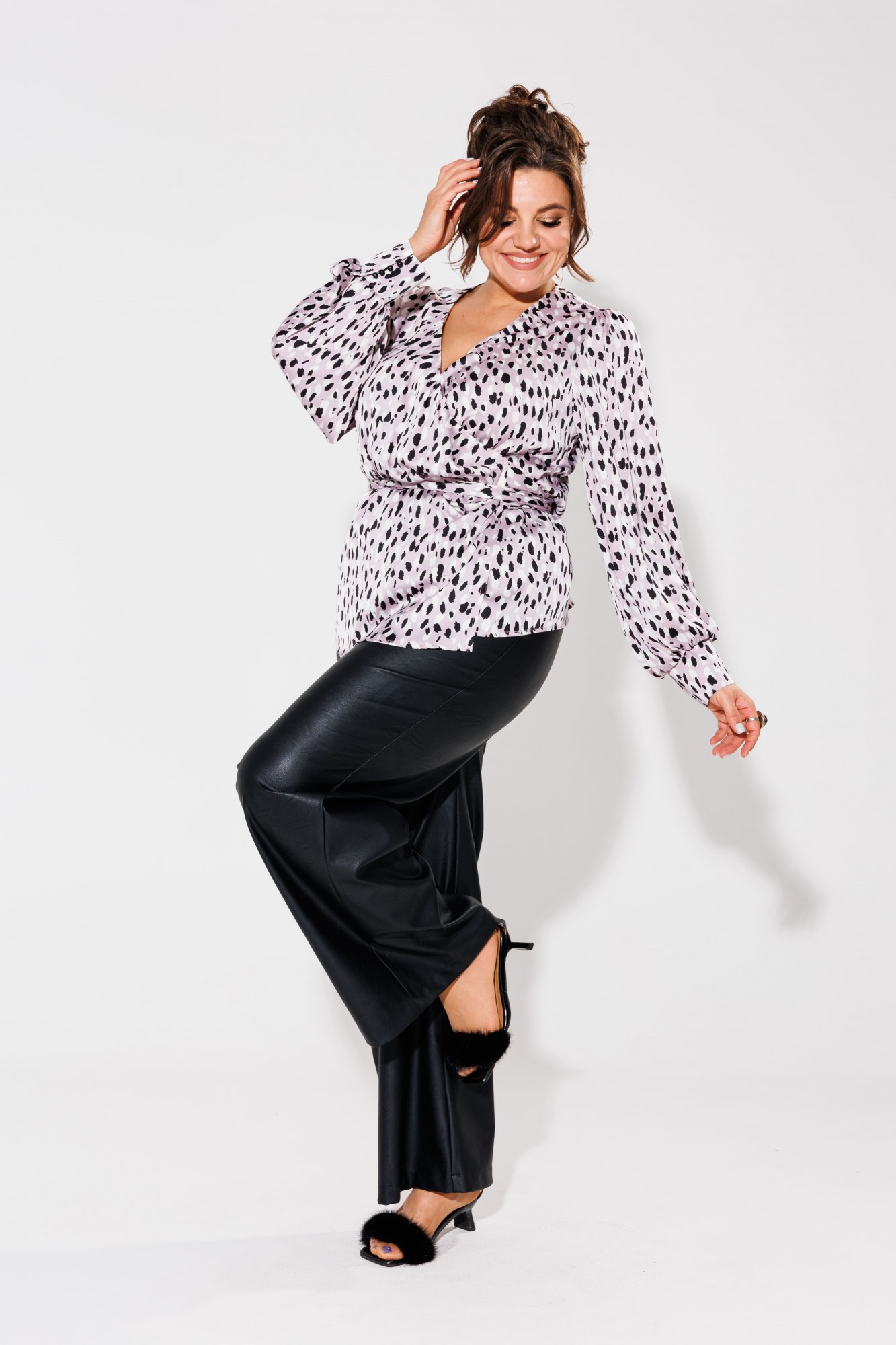 V-образный вырез горловины придаёт блузе женственность и изысканность. Создайте неповторимый образ с этой блузой, обладающей прекрасными расцветками и нежной фактурой.
