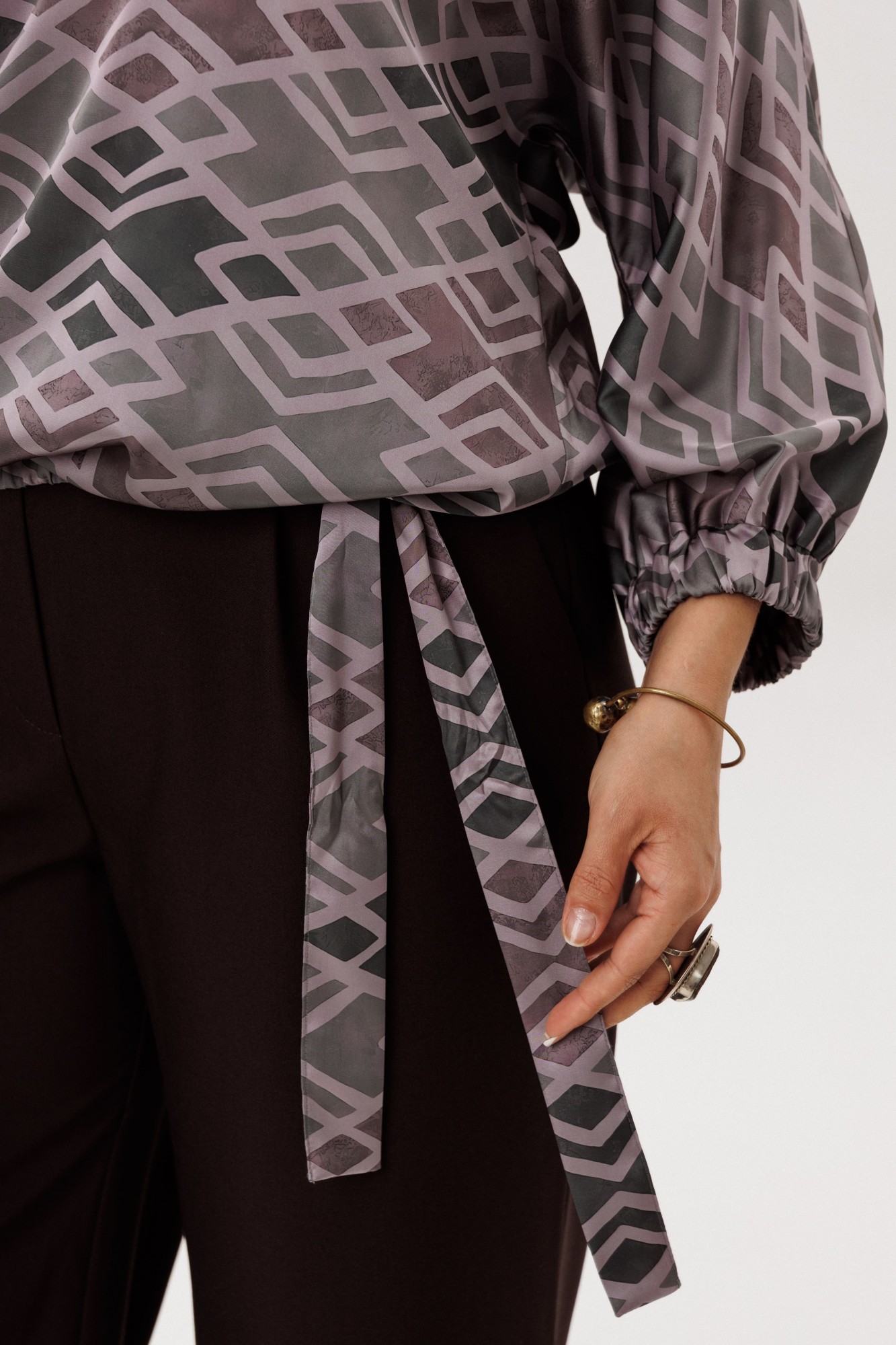 Особую динамику и индивидуальность блузе придают детали: цельнокроеные рукава три четверти подчёркивают целостность и плавность линий, а притачной пояс и манжеты, собранные в нежную сборку благодаря эластичной резинке, создают выразительный контраст с текучестью основной ткани. Эта умная конструкция позволяет вам самостоятельно регулировать длину блузы, творчески преобразуя её силуэт — от парящего и расслабленного до более собранного и чёткого.