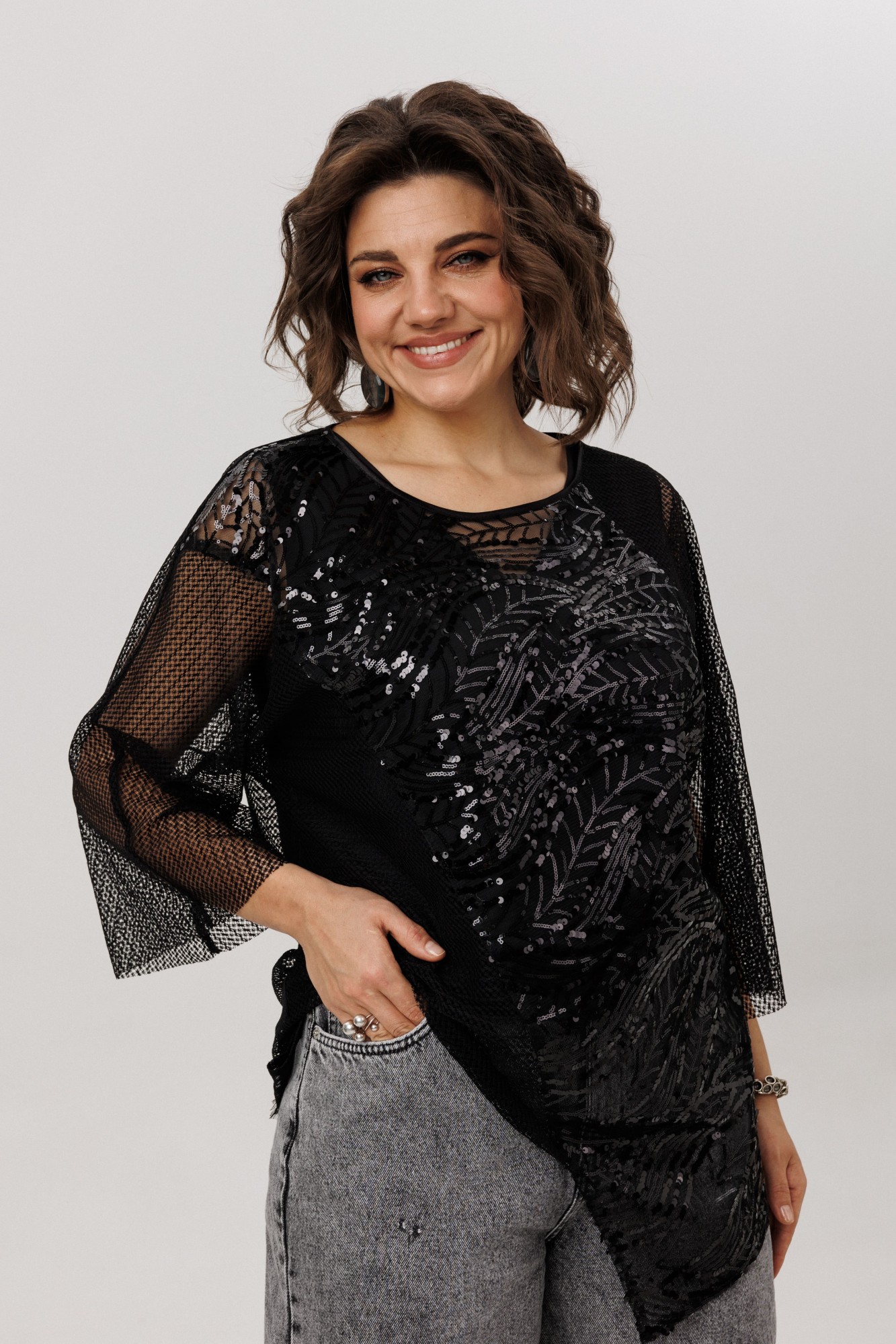 Эта блуза от Анелли, в которой рождается праздник. Её силуэт — лёгкое облако, струящееся в свободе кроя. Цельновыкроенный рукав, мягко раскрывающий запястье, и круглый вырез лишь подчёркивают изящную игру фактур. Основная часть, воздушная и прозрачная, как дымка, соткана из тончайшей сетки, сквозь которую мерцает кружевная тайна низа.
