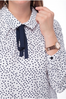 Блуза свободного кроя. скругленный воротник стойка, декорирован бантом. застежка на пуговицы по спинке платья. Декор продолжение пуговиц по спинке, имитация фальшь застежки.