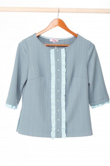 Полочка с нагрудными вытачками и декоративной планкой с красивыми пуговками и отделкой в виде шелковых сосборенных лент.Втачной рукав с такой же отделкой по низу.