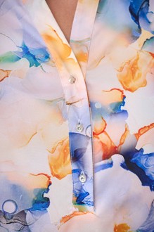 Блуза женская полуприлегающего силуэта, длиной до бедра. Рукав втачной, длинный, низ на манжете, застежка на петлю пуговицу. По переду фигурная планка на петли пуговицы, нагрудные вытачки, по боковому шву небольшие разрезы. По спинке талиевые вытачки. Горловина обработана стойкой. Блуза является хорошей базой, подчеркивает ваши достоинства. В ней вам будет комфортно, а актуальные принты добавят стиля вашему образу.