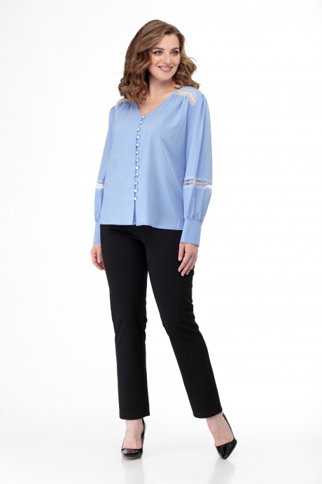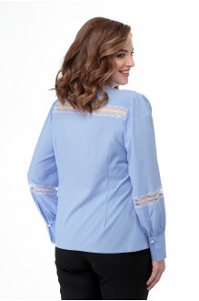Перед и спинка с романтичными кокетками и кружевными вставками, v-образный вырез горловины, застежка на навесные петельки и пуговицы. Втачной рукав на манжете и кружевной вставкой.