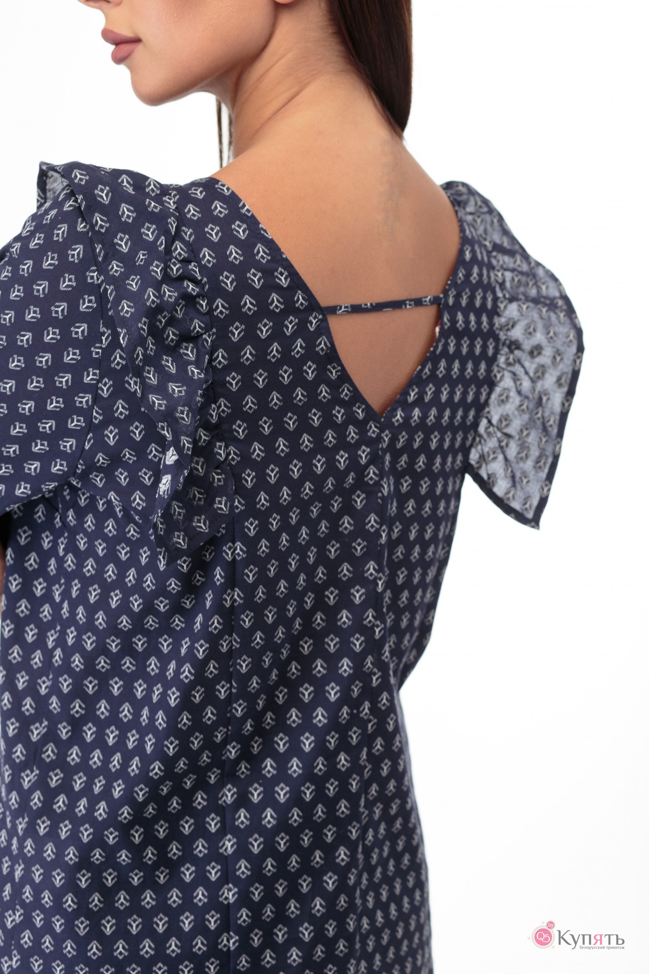 Блуза прямого силуэта, умеренного объёма, средней длины. На передней части выполнена V образная кокетка , которая оформлена ассиметричным рюшем, переходящим на спинку.