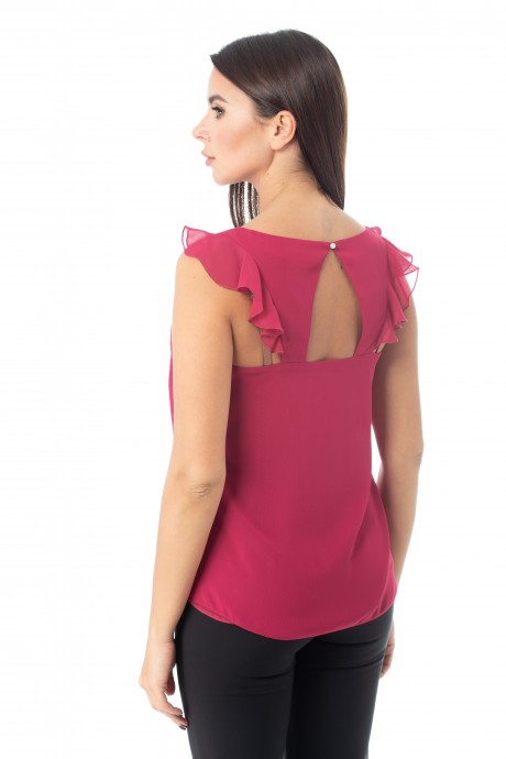 На грудные вытачки на передней части, спинка и перед двухслойные, спинка оформлена подрезными кокетками фантазийной формы, обрамлены рюшами по линии проймы.