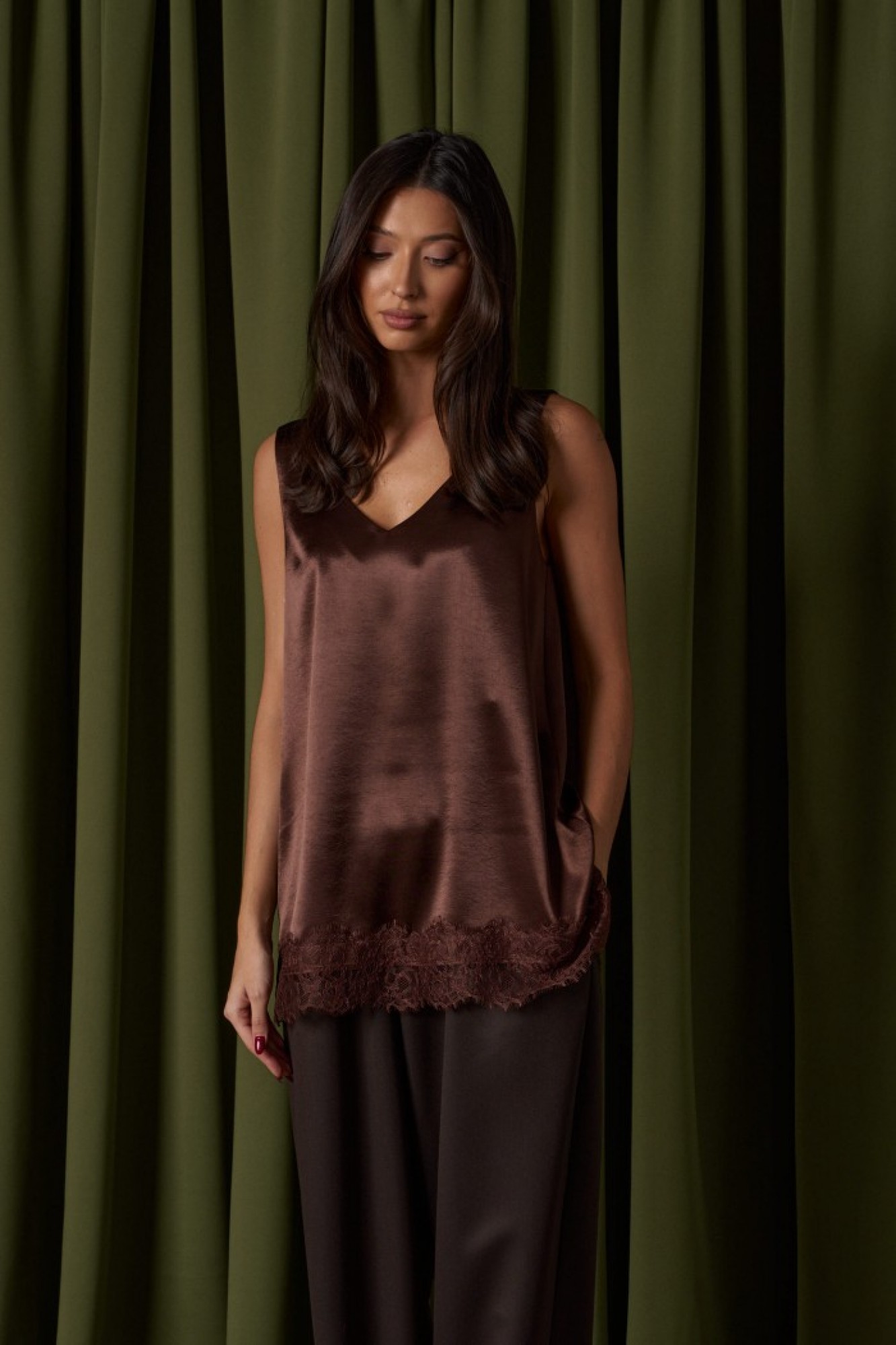 Блузон в крое трапеция, выполнен из струящейся ткани коричневого цвета. Характеристика: крой трапеция - расширяется к низу, широкие бретели, спереди v-образный вырез, по спинке овальная горловина, спинка изделия чуть удлинена, по низу изделия пришито кружево.