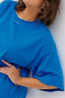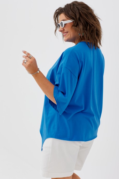 Изысканная и стильная летняя футболка свободного силуэта подарит Вам лёгкость и комфорт в жаркую погоду. Выполнена из хлопкового трикотажа со стрейчем. Горловина футболки полукруглой формы обработана обтачкой с декоративными рваностями и декорирована термо-надписью. Линия плеча спущена. Рукав слегка расклешён к низу и обработан плоскошовной строчкой, по линии подгибки – декоративные рваности. Низ переда с фигурными деталями, декорированными металлическими полукольцами белого цвета. Эта эффектная футболка, сочного цвета- идеальный летний вариант для прогулок, походов по магазинам, пляжного отдыха. Дополнив образ джинсами, шортами, кедами или сандалиями, а также легкой сумкой и аксессуарами, Вы сможете создать свежий и модный лук, подчеркивая вашу индивидуальность в жаркое время года. На фото представлены шорты арт. 8006.