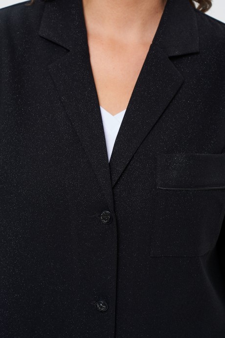 Блуза женская, нарядная, из текстильной ткани с умеренным блеском, свободного силуэта, воротник пиджачного типа, рукав втачной, по низу манжета. По переду блузку имеются нагрудные вытачки, по спинке кокетка и складка, низ фигурный. Длина по спинке 81 см, длина рукава 58 см.
