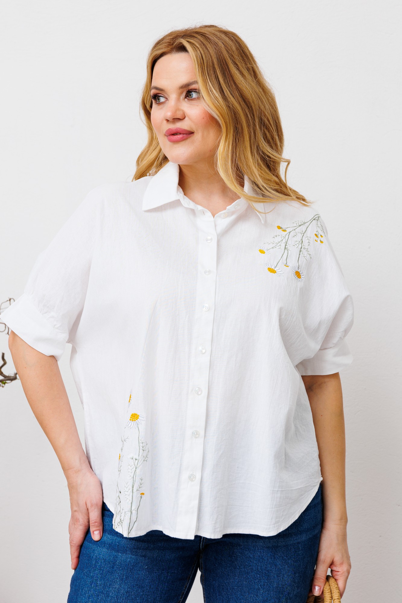 Хлопковая блузка с укороченным рукавом. Застежка на петли-пуговицы. По переду выполнена яркая нежная вышивка.