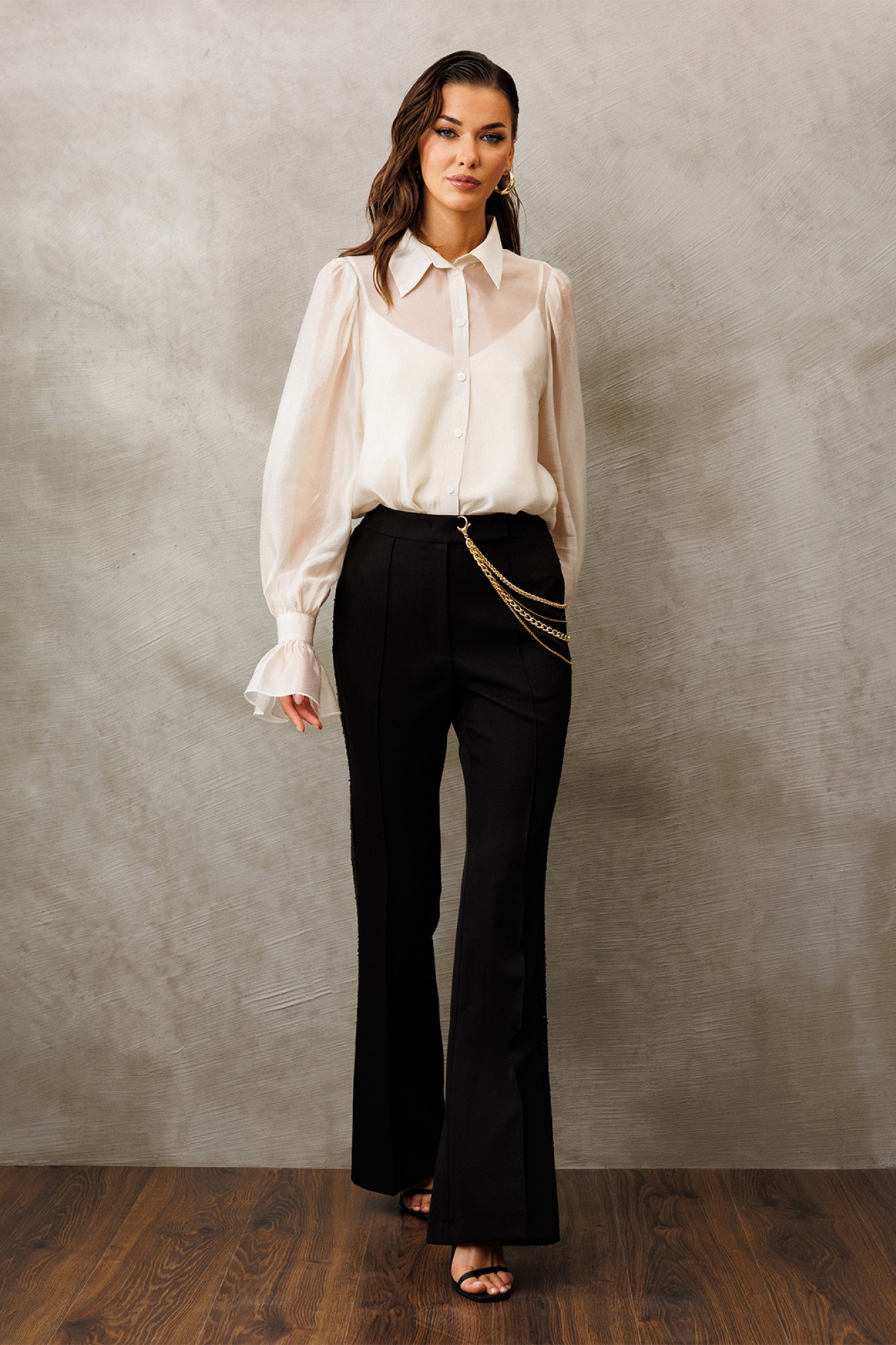 Блузка из креп-шифона с напылением. Прямого силуэта, с втачным рукавом вверху со сборкой внизу на манжете с застежкой на петлю-пуговицу и рюшей на манжете. Полочка с центральной застежкой на петли-пуговицы на цельнокроеной планке. Воротник рубашечный отложной на стойке. Внизу по боковым швам обработаны разрезы. К блузке идет в комплект атласный топ на регулируемых бретелях прямого силуэта, на широкой обтачке. Полочка с V-образным вырезом и нагрудной вытачкой.