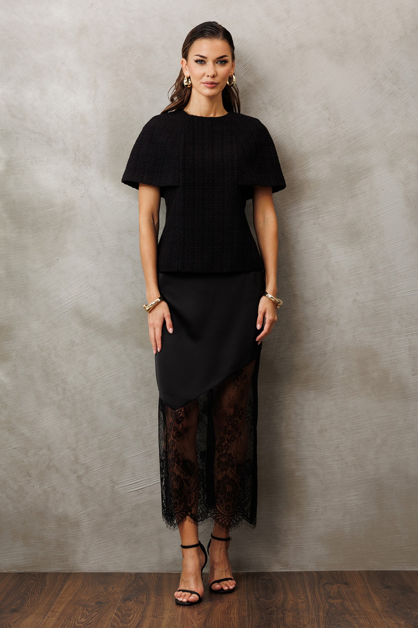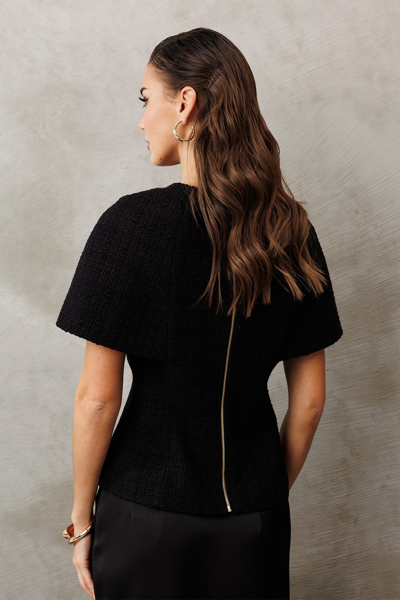 Блузка-кейп из костюмной ткани прилегающего силуэта без рукавов. Полочка и спинка с рельефами. Спинка с центральной застежкой на тесьму-молнию. Блузка на подкладке.