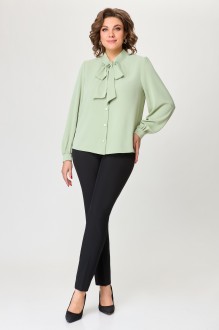 Блузка женская прямого силуэта, с центральной застежкой по переду на петли и пуговицы. По горловине переда-легкая сборка, воротник стойка, переходящая в бант. Рукав длинный, со сборкой по окату и по низу, заканчивающейся манжетой, с застежкой на петлю и пуговицу.