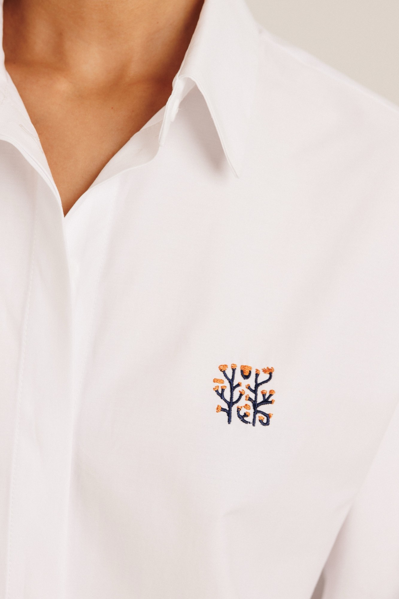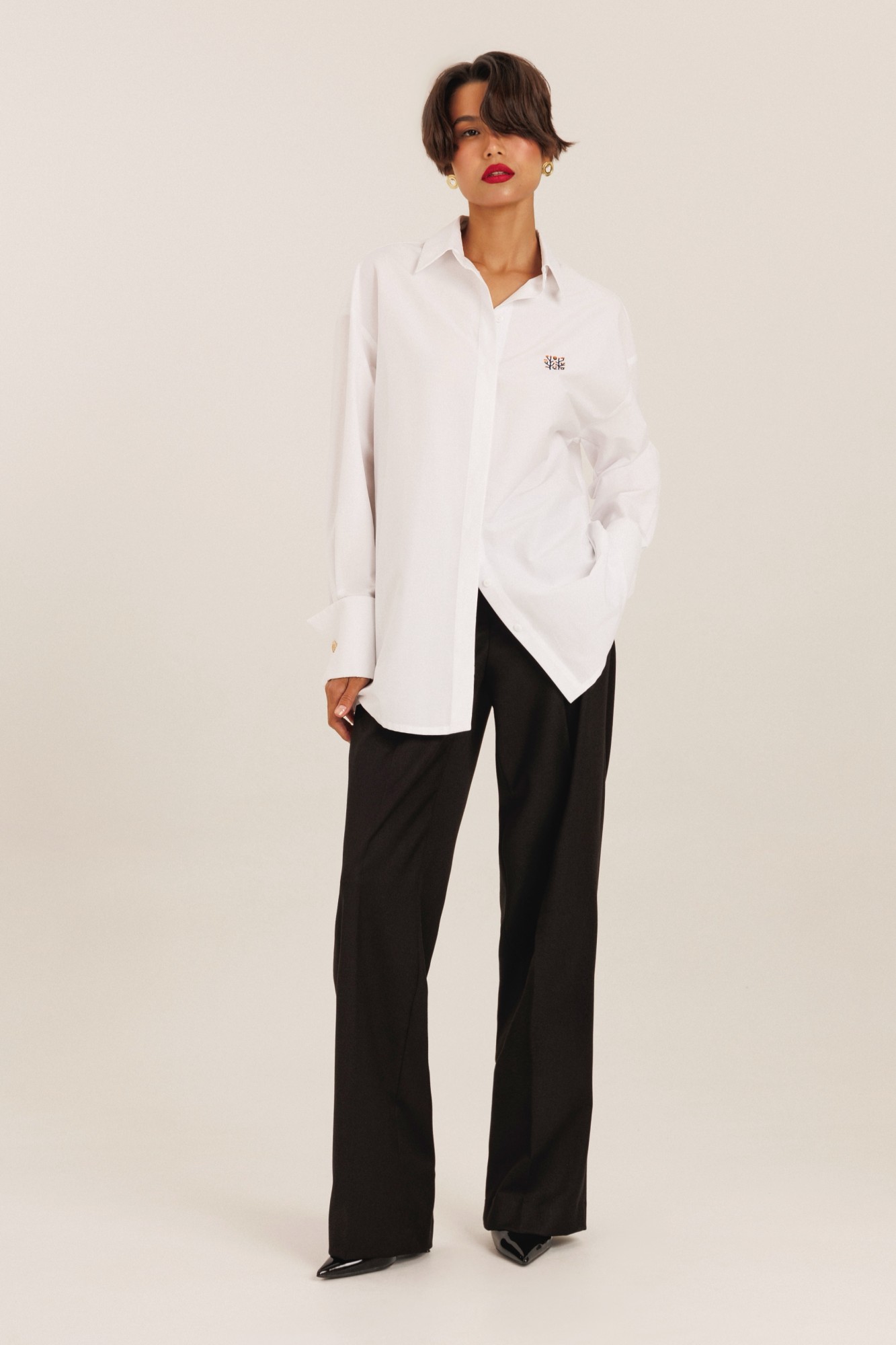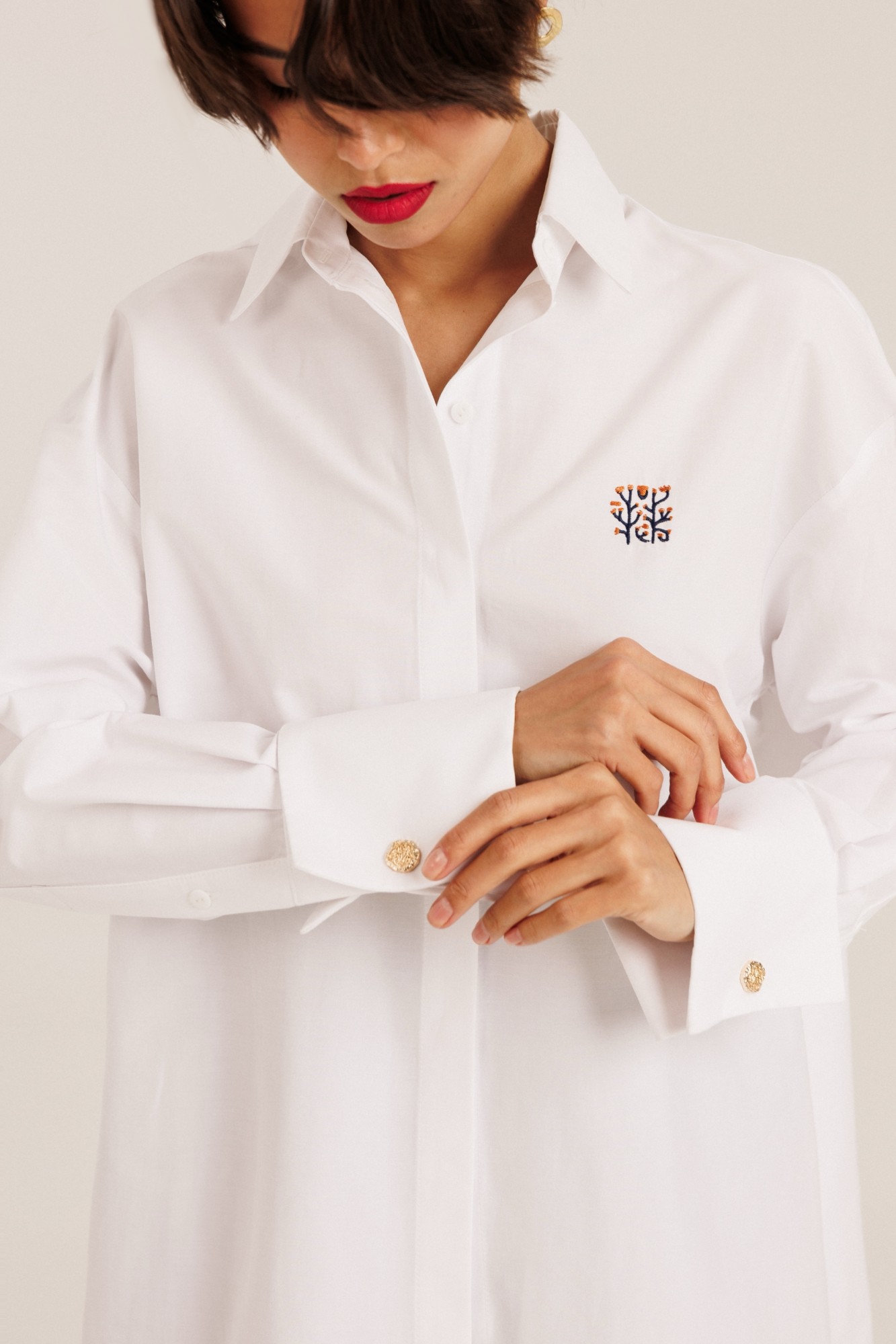 Блузка женская "оверсайз" прямого силуэта. Воротник отложной на стойке. Рукав спущенный с притачной широкой манжетой с отворотом и с акцентной пуговицей. Разрез рукава обработан планкой. Застежка по переду потайная, на пробивные петли и пришивные пуговицы. Дизайнерская вышивка.