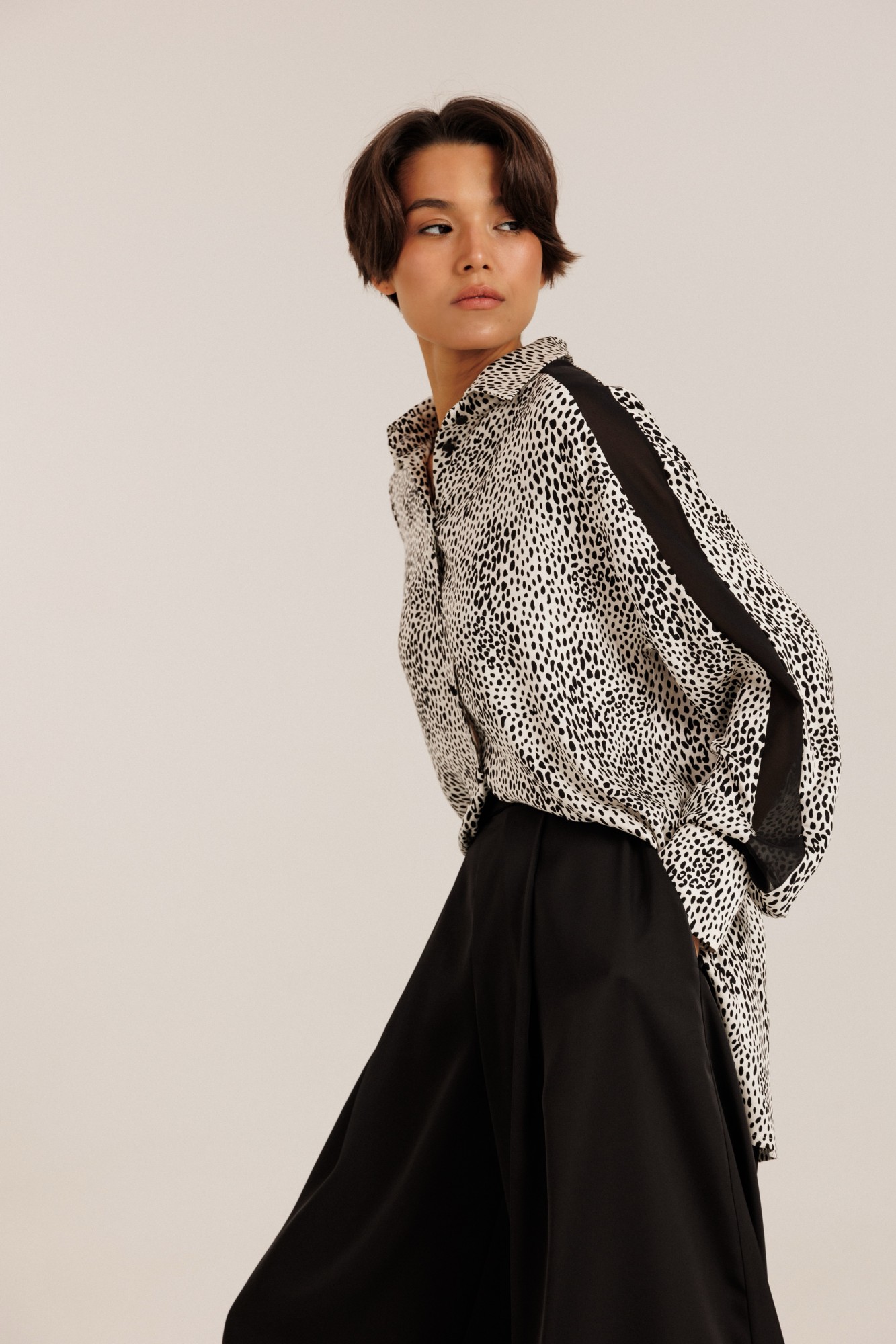 Блузка женская прямого силуэта. Борт обработан цельнокроеными планками. Низ блузки прямой. Рукав втачной, спущенный, с манжетой по низу. По плечевому шву и рукаву имеется декоративная цельнокроеная вставка из шифона. Спинка на кокетке.