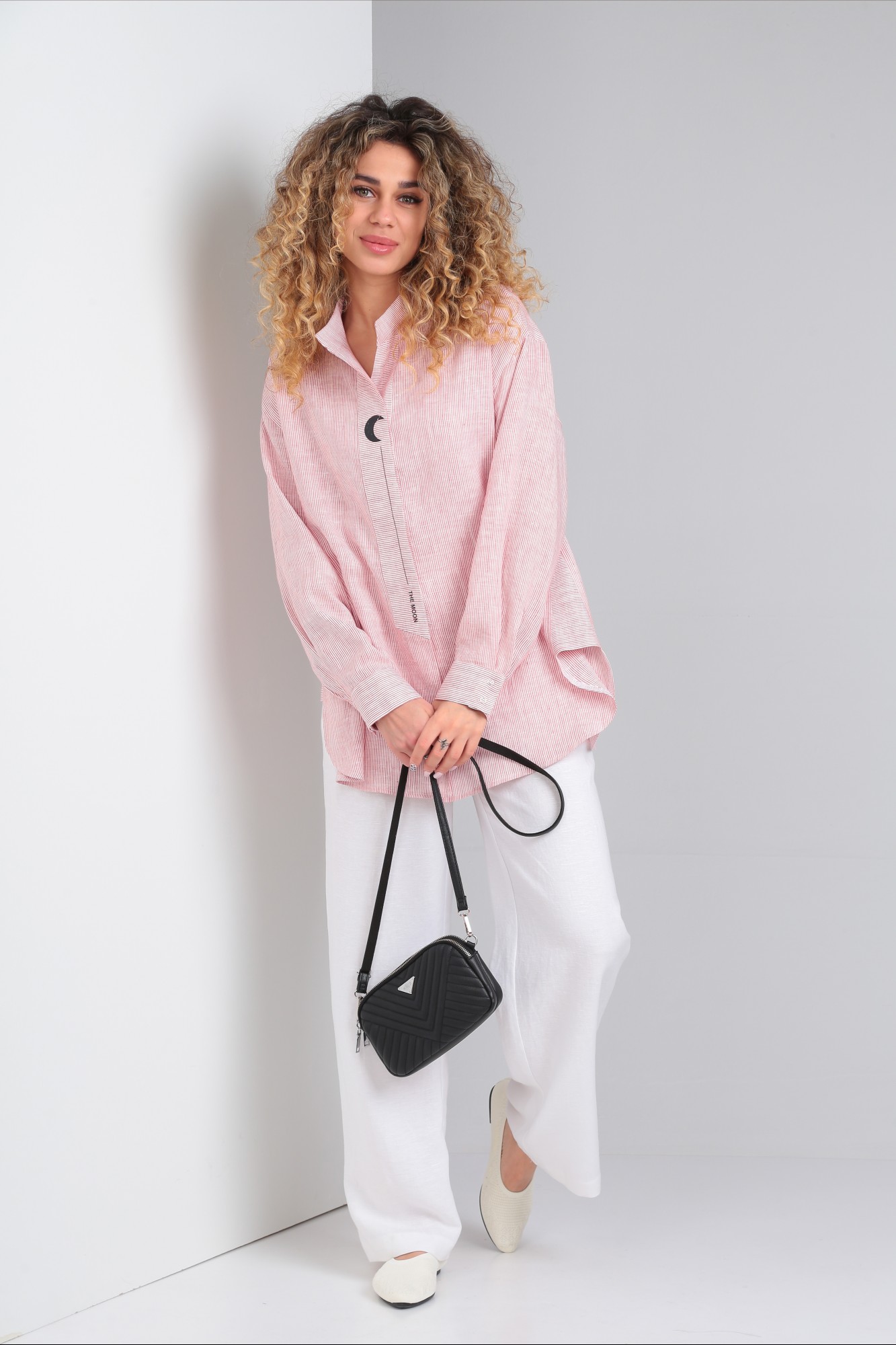 Брузка рубашечного типа из натурального умягченного льна, свободного силуэта, рукав втачной с манжетой, воротник стойка. Потайная застёжка на кнопки. Низ фигурный. Спинка на заниженной кокетке. И декоративной застрочной складкой.