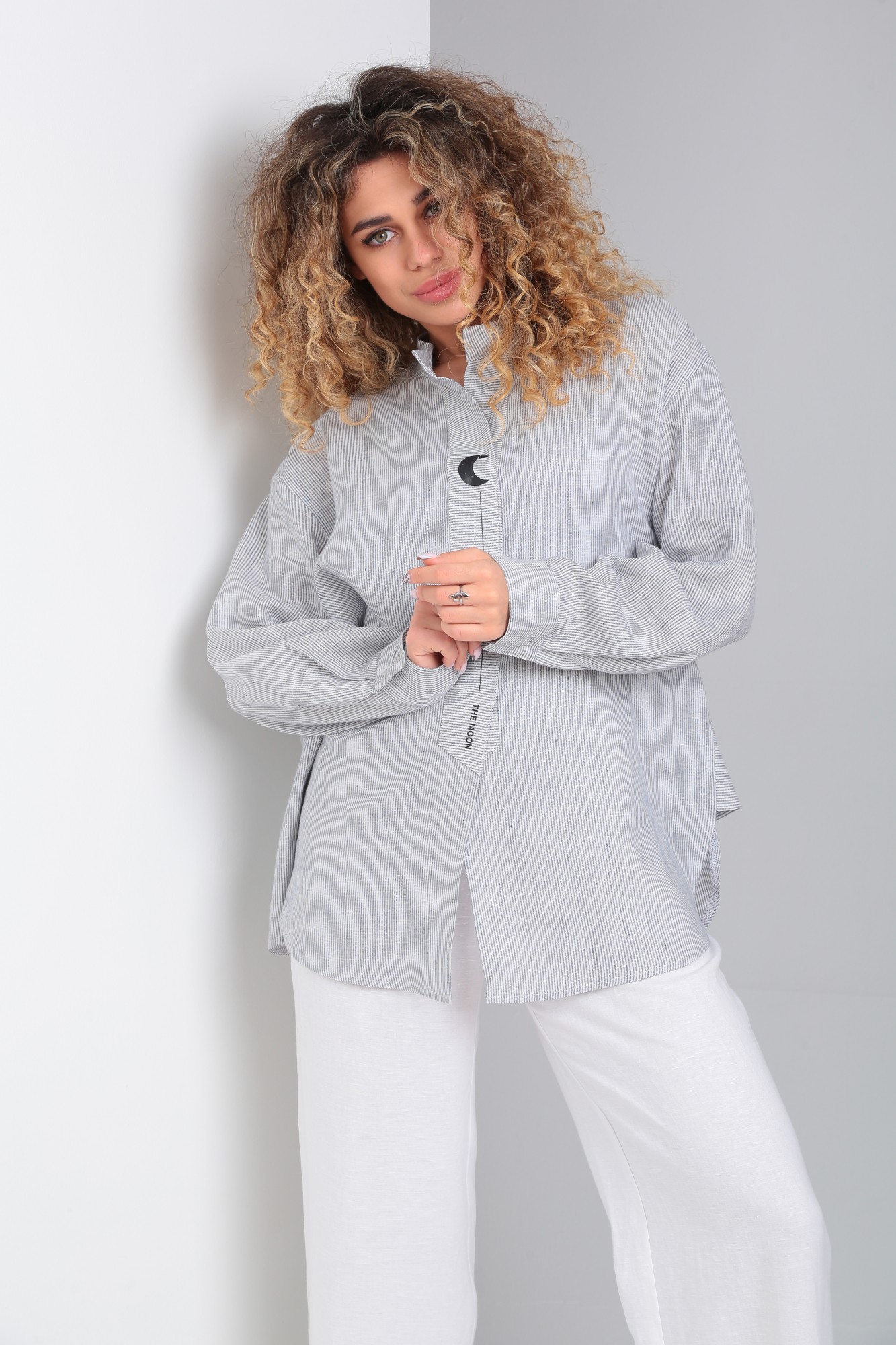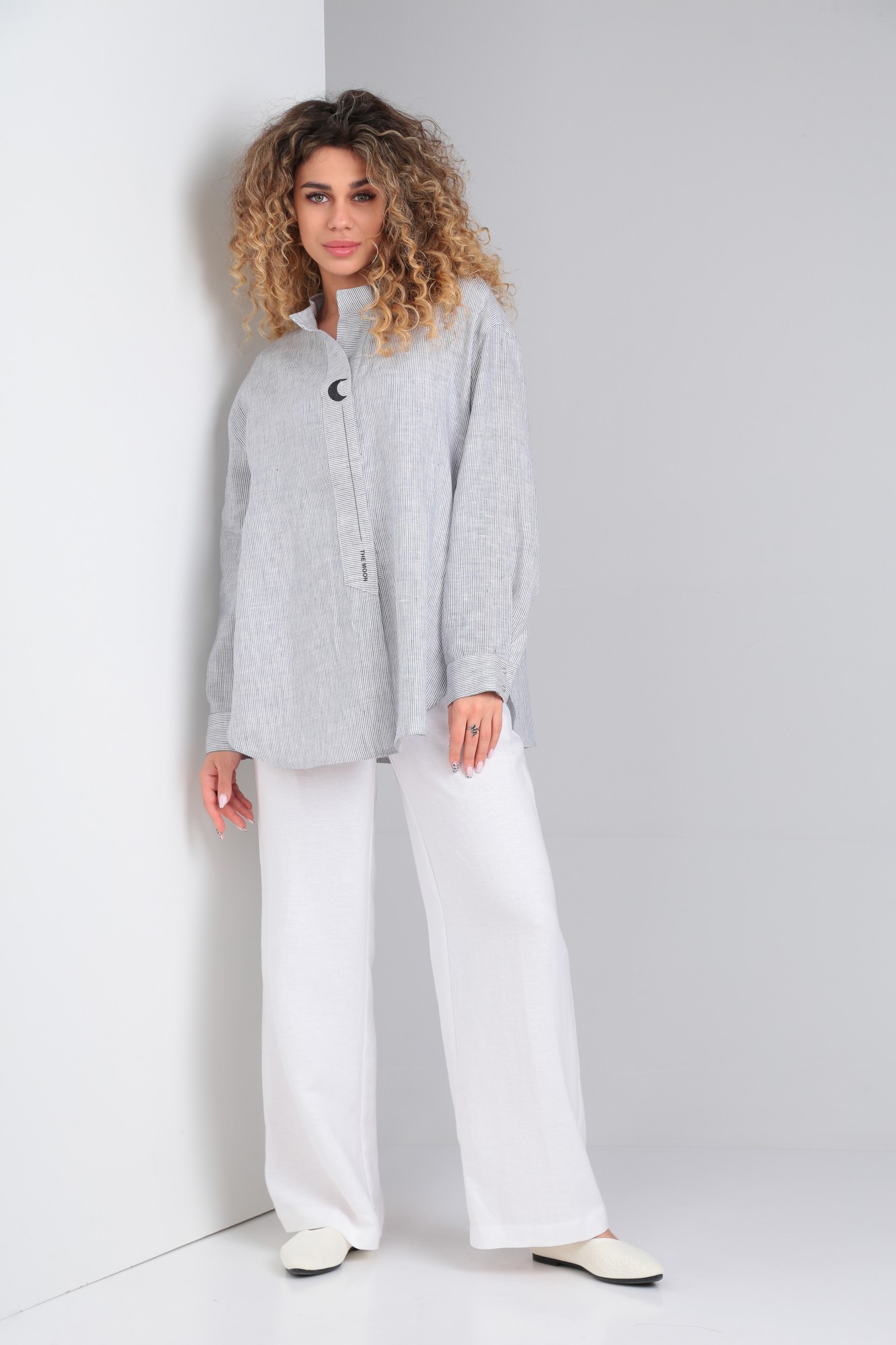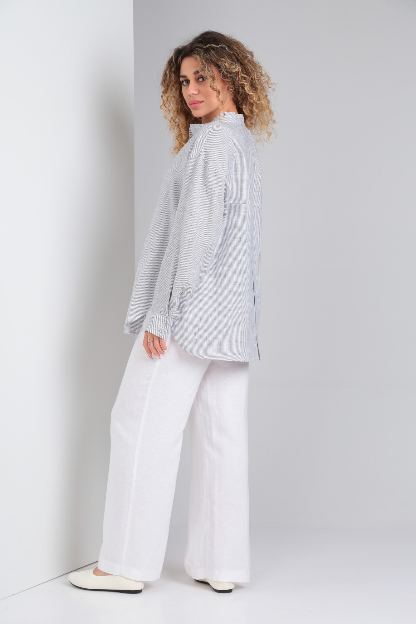 Брузка рубашечного типа из натурального умягченного льна, свободного силуэта, рукав втачной с манжетой, воротник стойка. Потайная застёжка на кнопки. Низ фигурный. Спинка на заниженной кокетке. И декоративной застрочной складкой.