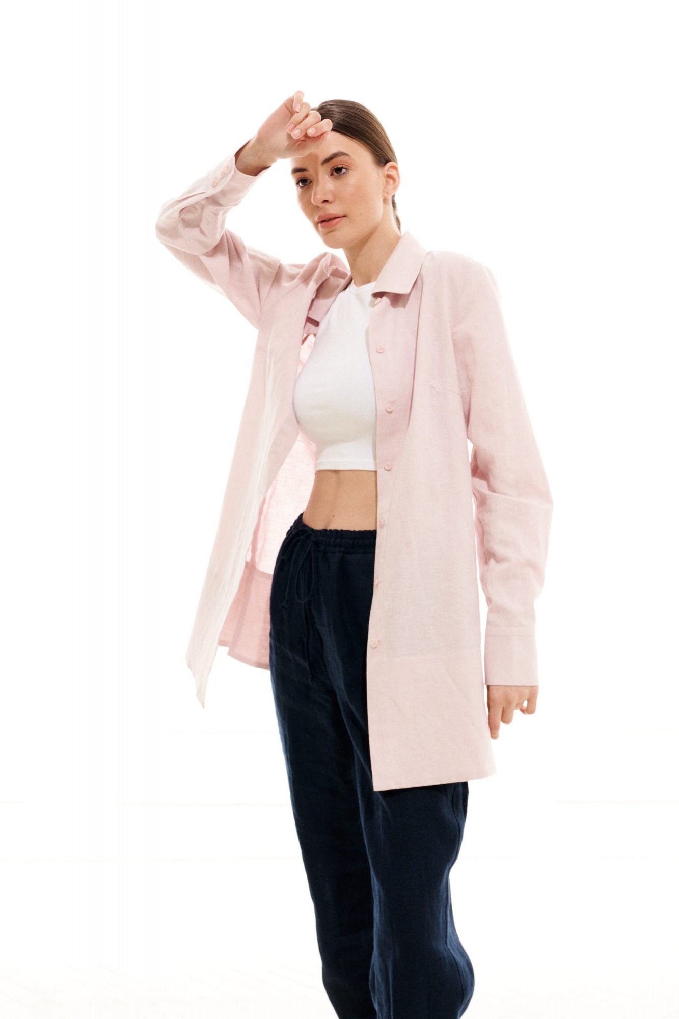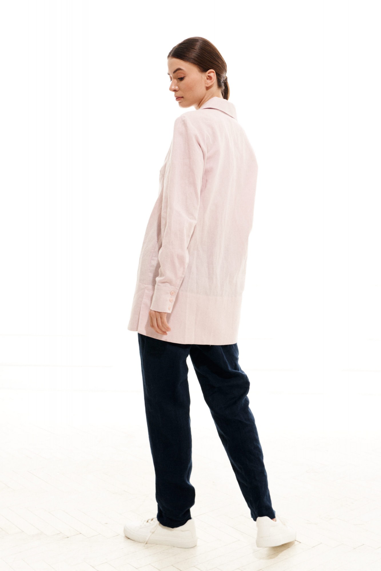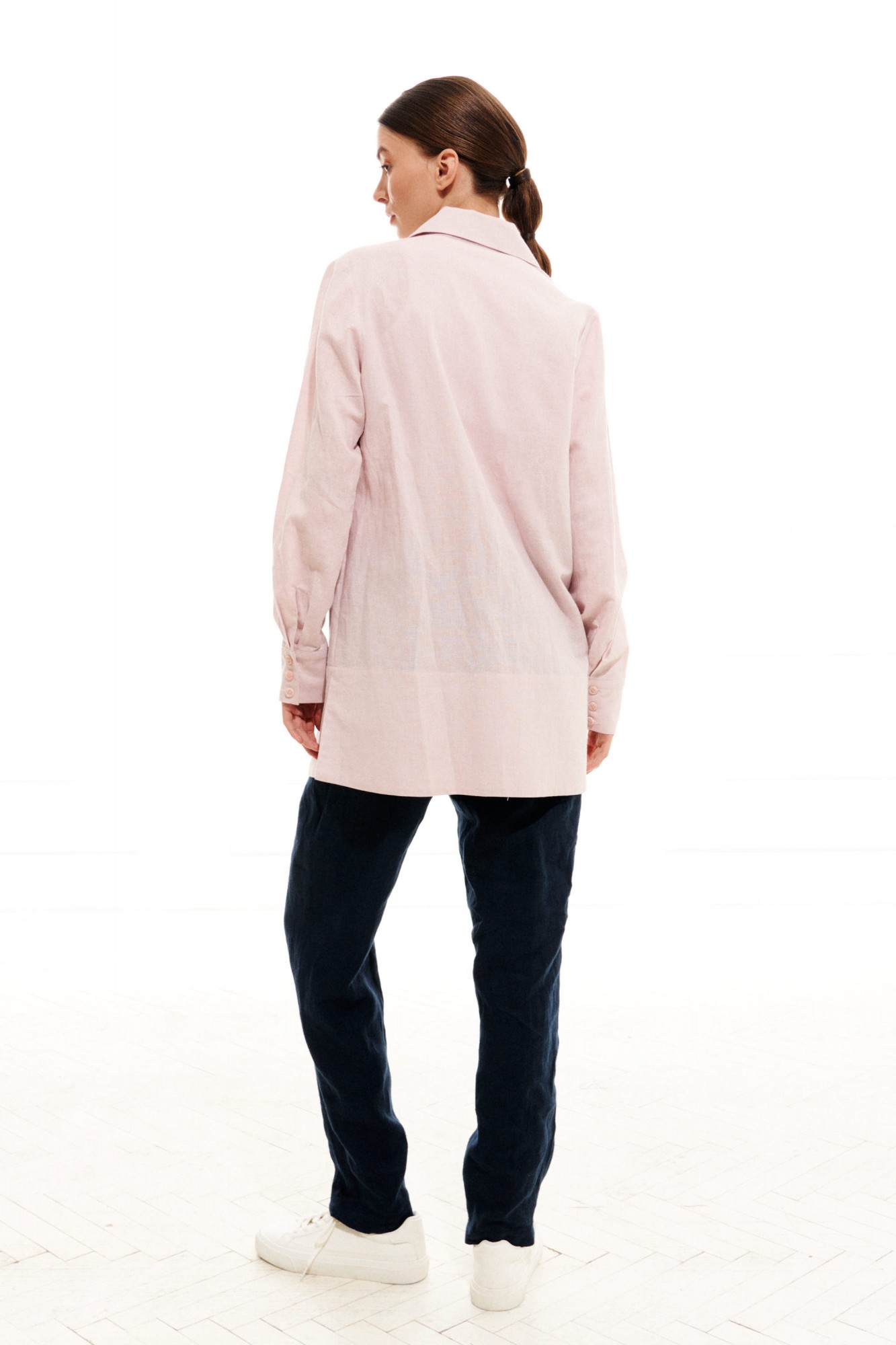 Блузка женская, прямого силуэта, длиной ниже линии бедер из плательно-блузочной ткани. Перед с нагрудными вытачками, цельнокроеными планками и застежкой на петли, пуговицы. Низ обработан широкой планкой - обтачкой. В боковых швах разрезы. Рукав одношовный, втачной, длинный, с разрезом в локтевом шве и притачной манжетой с застежкой на петли, пуговицы. Воротник рубашечный на отрезной стойке.
