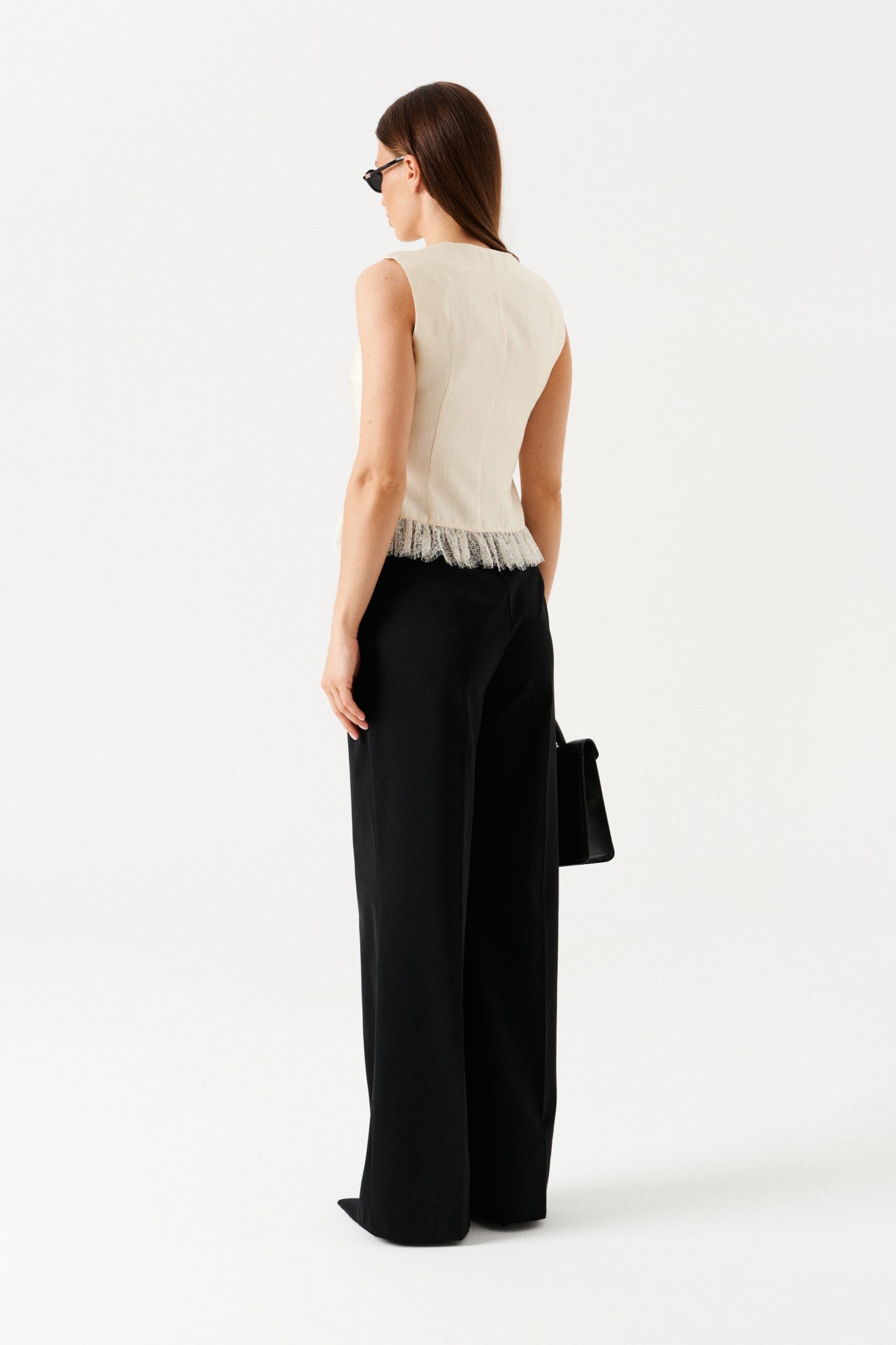 Блузка полуприлегающего силуэта, с центральной застежкой на навесные петли и пуговицы, круглым вырезом горловины. Перед с нагрудными вытачками. Спинка со средним швом и таллиевыми вытачками. Линия низа оформлена кружевом.