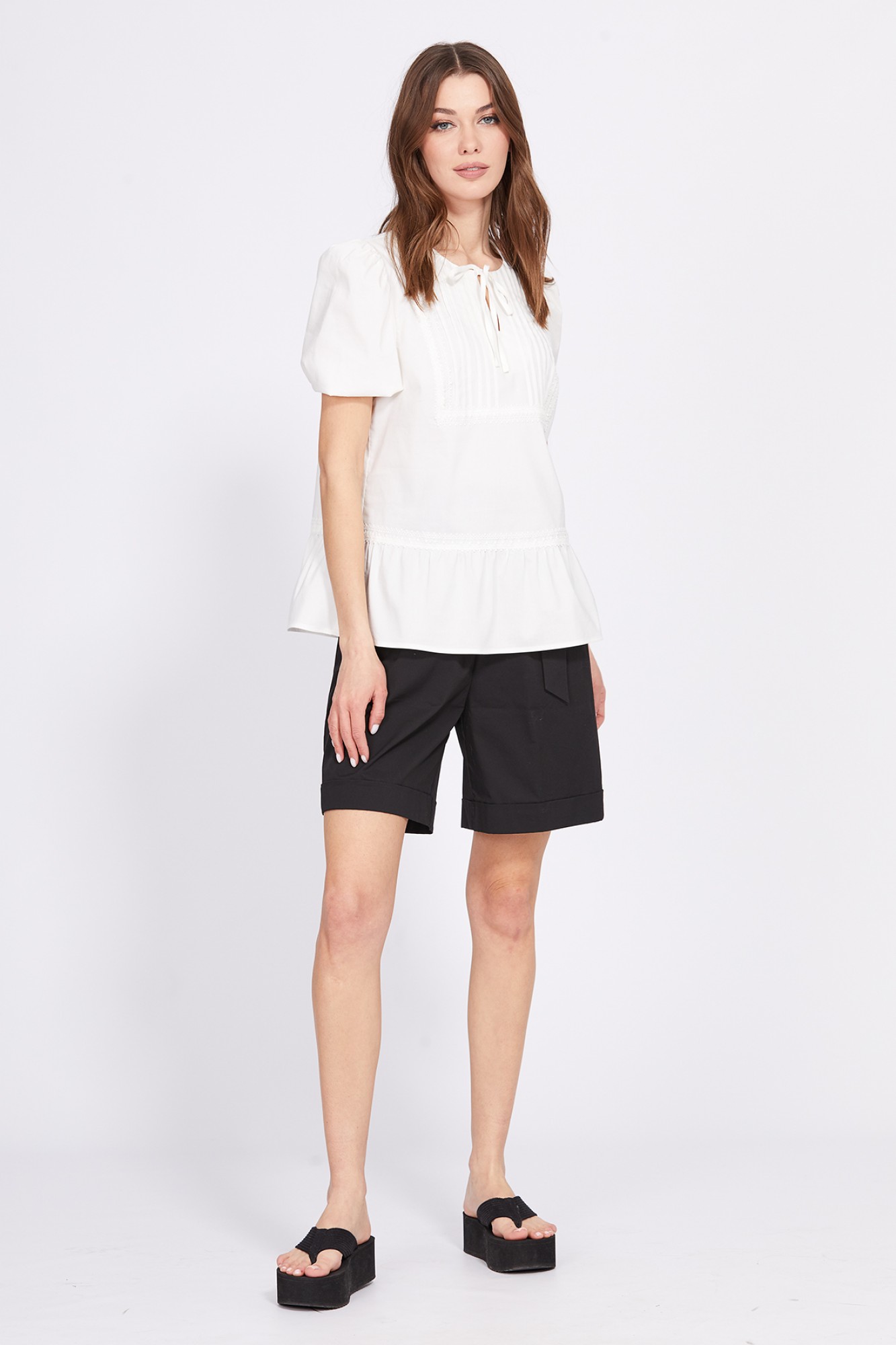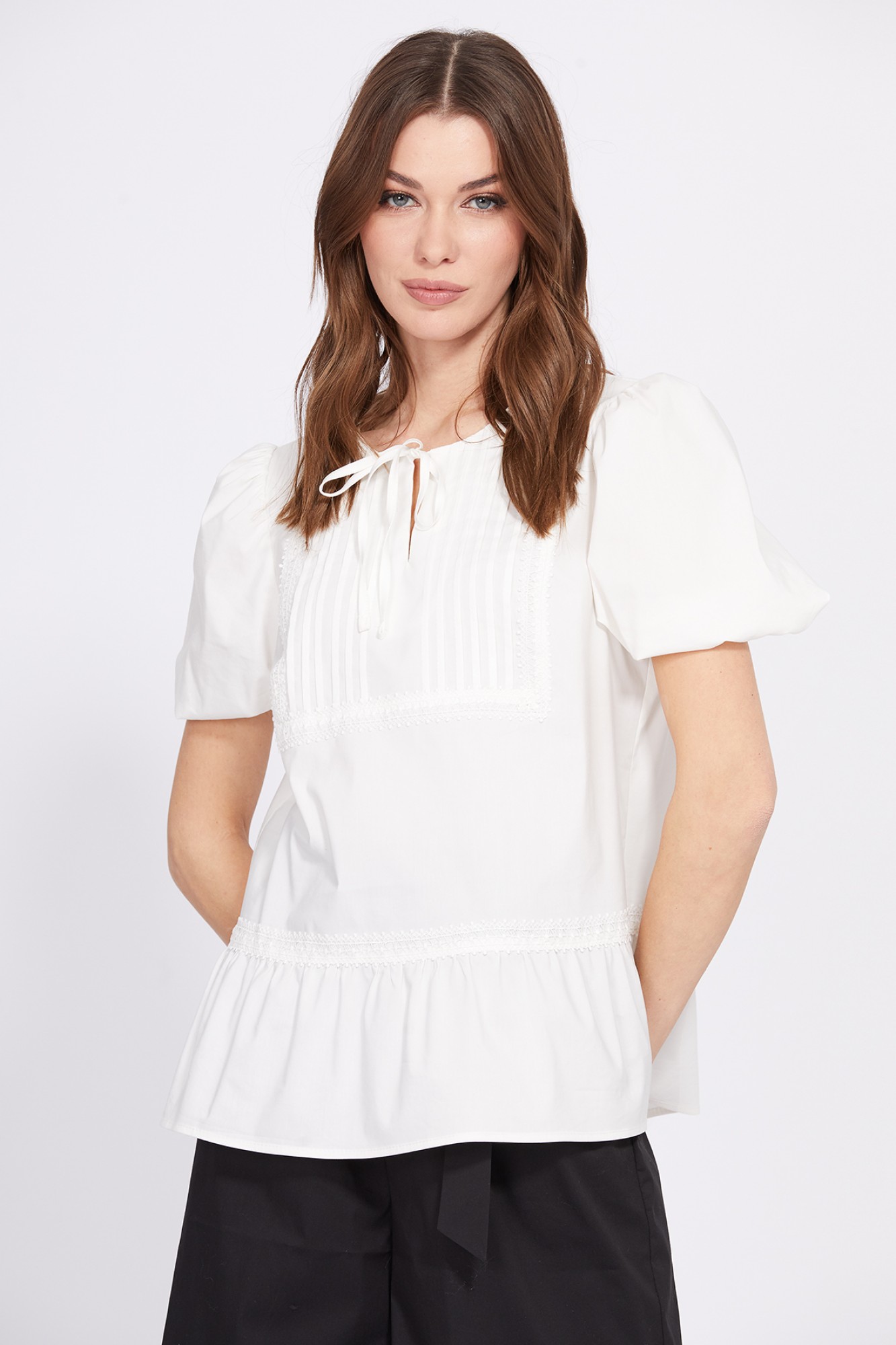 "Блузка выполнена из стрейчевой однотонной плательно-блузочной ткани. Блузка А-образного силуэта, длиной до линии бедер. Спереди фигурная кокетка с защипами и прорезь горловины с завязками. Горловина округлой формы с кружевом в шве. Спинка цельная с плечевыми вытачками. Плечевой шов укорочен. Рукав втачной, одношовный, со сборкой по окату. Низ рукава собран на эластичную тесьму. Низ блузки обработан баской со сборкой по линии притачивания. Блузка декорирована кружевом.