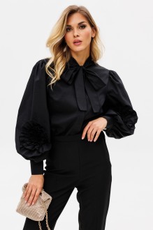 Блузка выполнена из плательно-блузочной ткани. Блузка прямого силуэта, длиной выше линии бедер. Спереди центральная застежка с потайной планкой. Спинка цельная. Воротник стояче-отложной, переходящий в бант. Рукав втачной одношовный, со сборкой по окату, расширенный и присборенный по низу. Низ рукава на притачной манжете с застежкой на пуговицу. В боковых швах разрезы. Блузка декорирована по рукавам объемными надстрочными цветами из основной ткани.