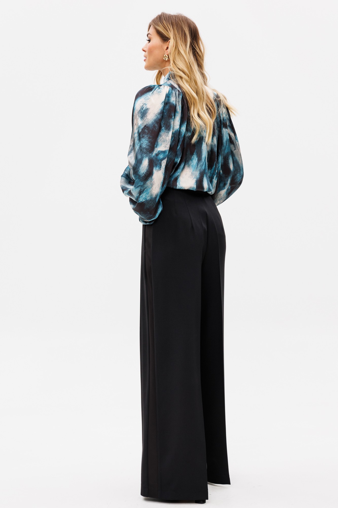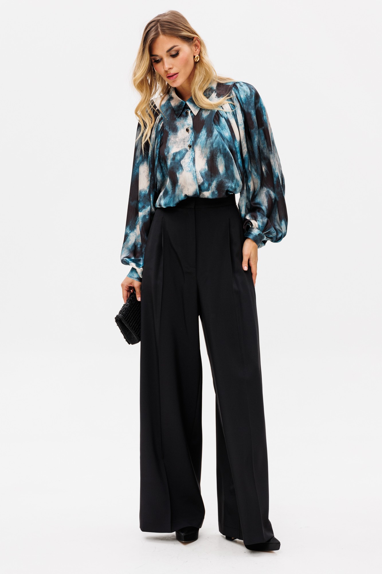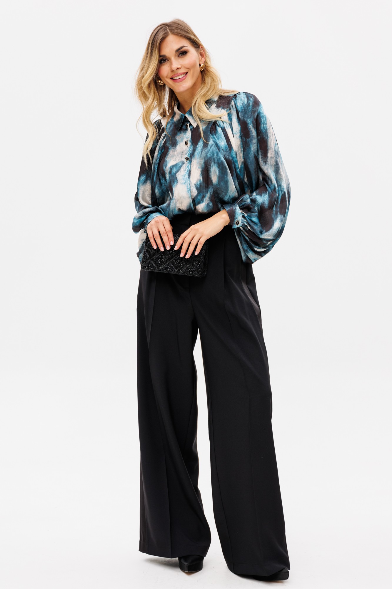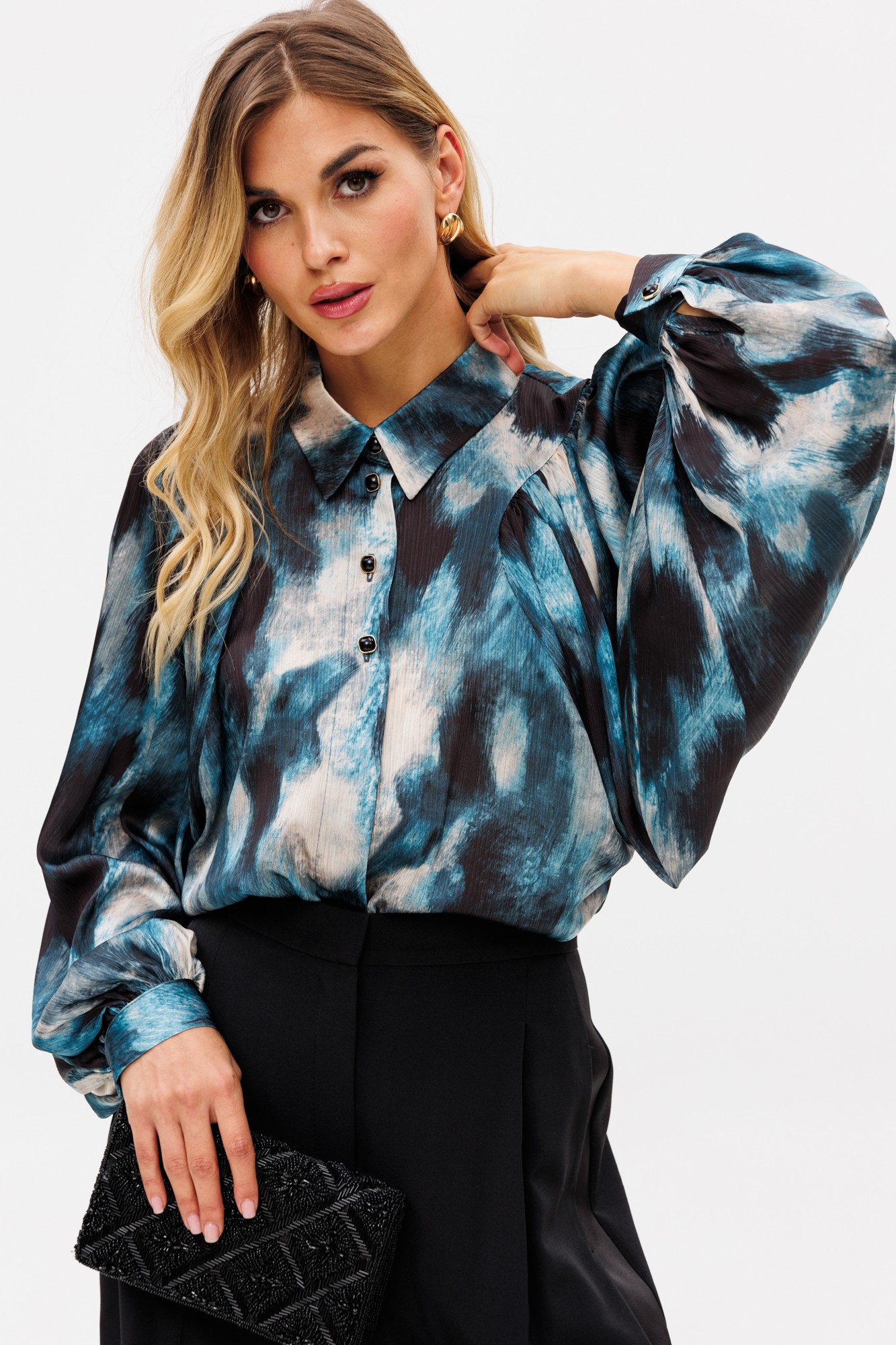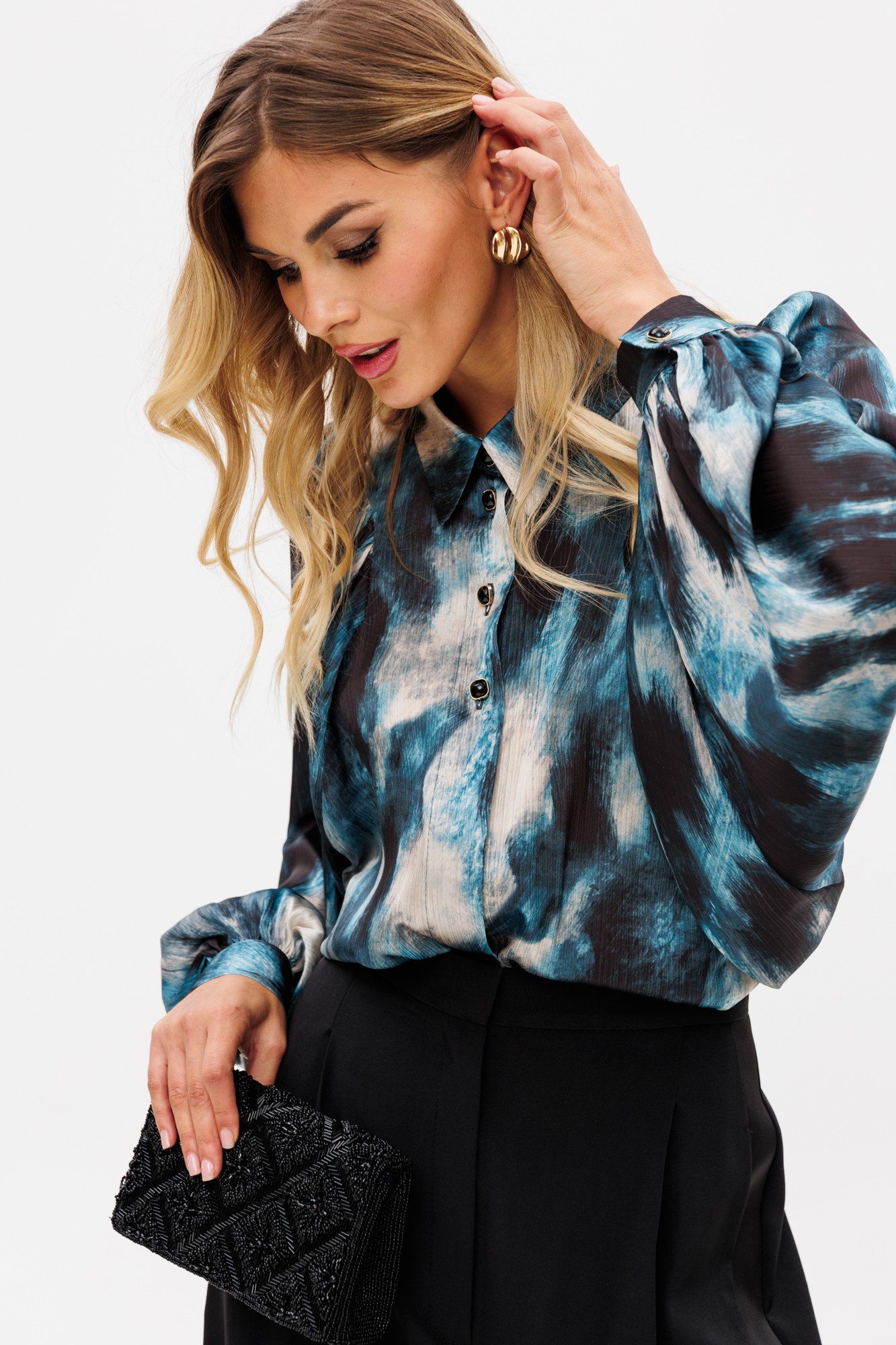 Блузка выполнена из атласа с принтом. Блузка О-образного силуэта, длиной до линии бедер. Спереди застежка на пришивные пуговицы, частично на потайной планке. Спинка цельная. Воротник стояче-отложной с отрезной стойкой. Плечевой шов заужен. Рукав цельнокроеный, с углубленной проймой. По окату и низу рукава сборка. Низ рукава на манжете, застегивающейся на пуговицу. В боковых швах разрезы.