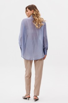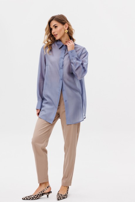 Блузка выполнена из плательно-блузочной ткани. Блузка прямого силуэта, длиной до линии бедер. Спереди центральная застежка на пуговицы. Воротник стояче-отложной. Плечевой шов удлинен. Рукав рубашечного кроя, одношовный с прорезью и двумя складками по низу. Рукав на притачной манжете. Низ блузки фигурной формы.