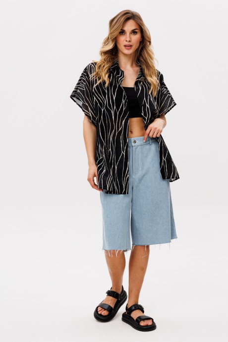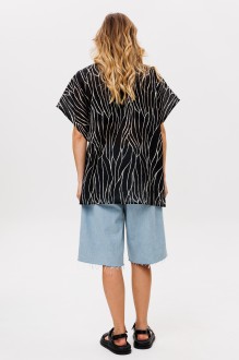 Блузка выполнена из плательно-блузочной ткани с принтом. Блузка прямого покроя, длиной до линии бедер. Спереди застежка с планкой на пуговицы. Спинка цельная. Воротник стояче-отложной. Плечевой шов удлинен. Рукав покроя ""кимоно"", длиной выше линии локтя.