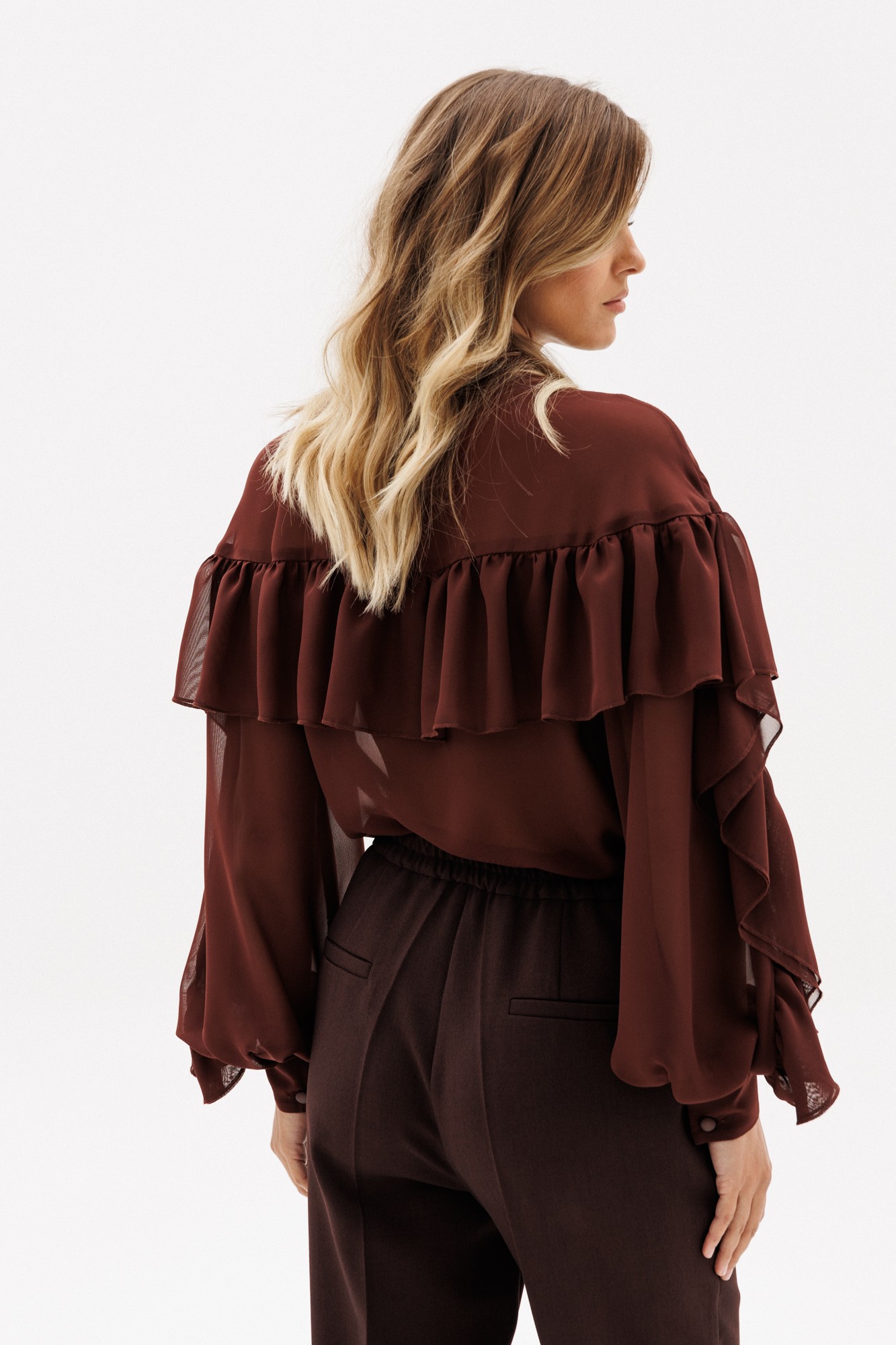 Блузка выполнена из шифона. Блузка прямого силуэта, длиной до линии бедер. Спереди средний шов и кокетка, V-образный вырез и завязки. Ни спинке кокетка. Воротник-стойка. Кокетка переда и спинки переходит на рукав. Рукав двухшовный, расширенный и присборенный к низу. Низ рукава на притачной манжете с застежкой на пуговицы. В боковых швах разрезы. Блузка декорирована оборками из основной ткани по линиям кокеток переда и спинки, и по верхнему шву рукава.