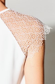 Женская базовая блуза полуприлегающего силуэта выполнена из лёгкой струящейся ткани. Рукава реглан, плавно переходящие на спинку и перед, выполнены из кружева; горловина окантована; по переду небольшой декоративный разрез. Блуза полностью соответствует заявленному размеру. Пожалуйста, пользуйтесь таблицей замеров готового изделия. Уход: - рекомендуется машинная стирка при температуре не выше 30 градусов, выбирайте деликатный режим стирки.