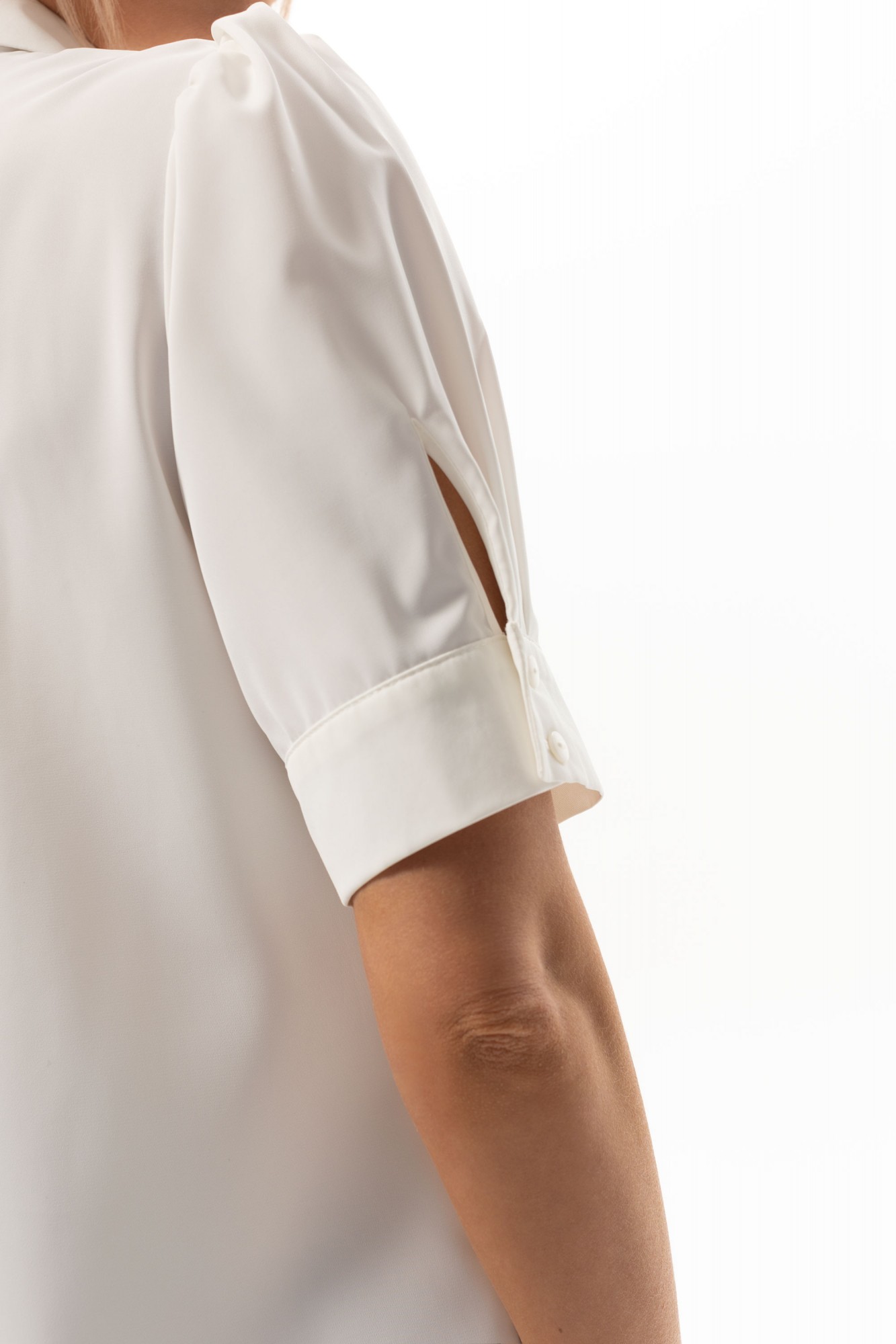 Блузка с центральной застежкой на петли и пуговицы по цельнокроеной планке переда, втачным воротником с отрезной стойкой. По переду нагрудные вытачки, две односторонние складки вдоль застежки. Спинка цельная. Рукав втачной, короткий, с отрезной манжетой. Окат рукава со сборкой. По шву притачивания манжеты- две односторонние складки.