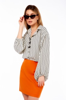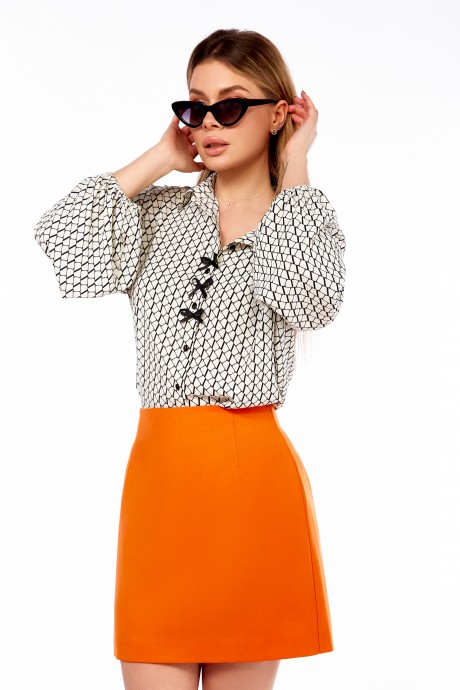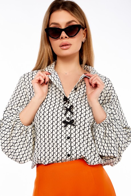 Блузка женская прямого силуэта, рубашечный воротник, застежка на петли и пуговицы, с декоративными пришивными бантиками из отделочной тесьмы. Рукав втачной, свободный, по низу на резинке.