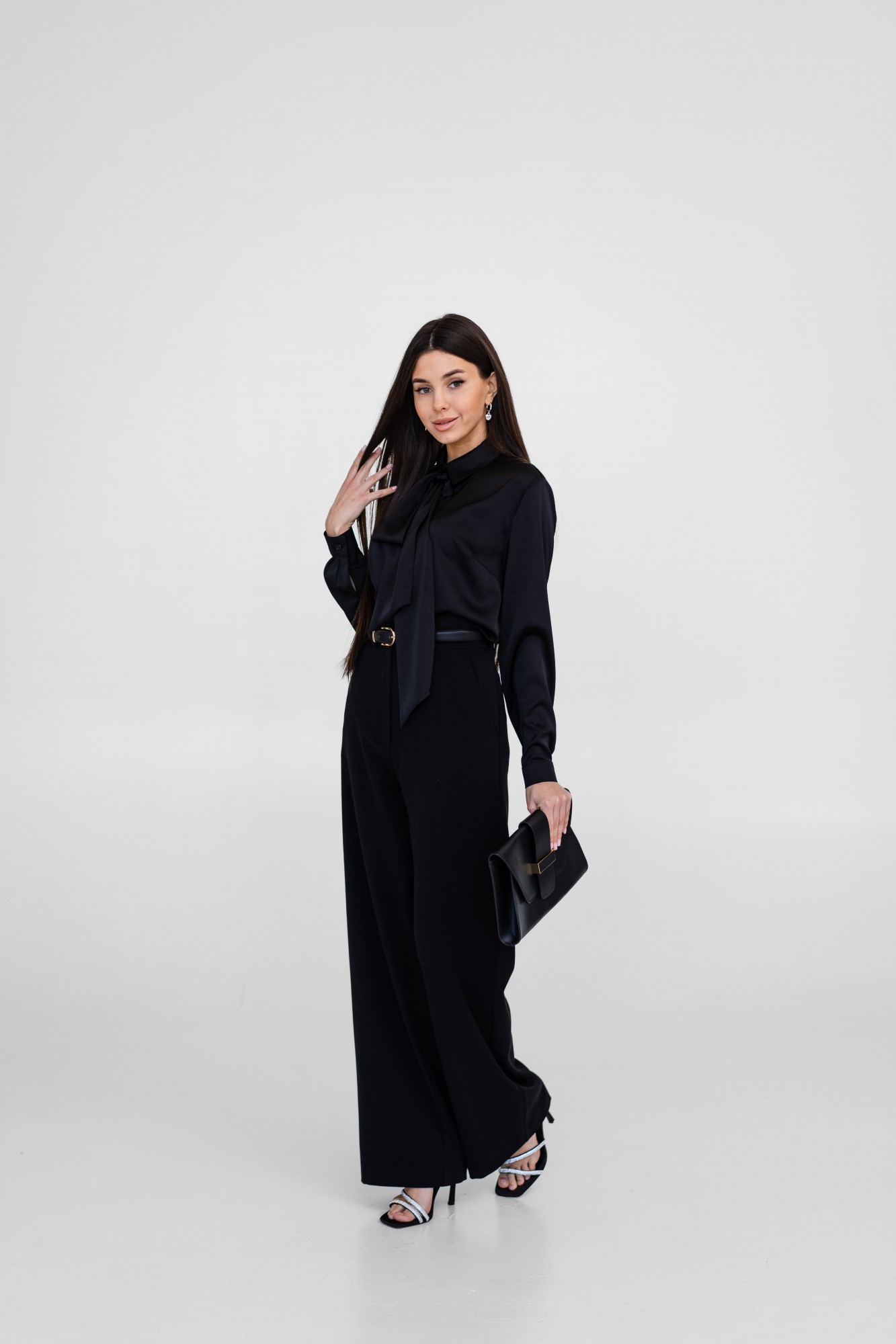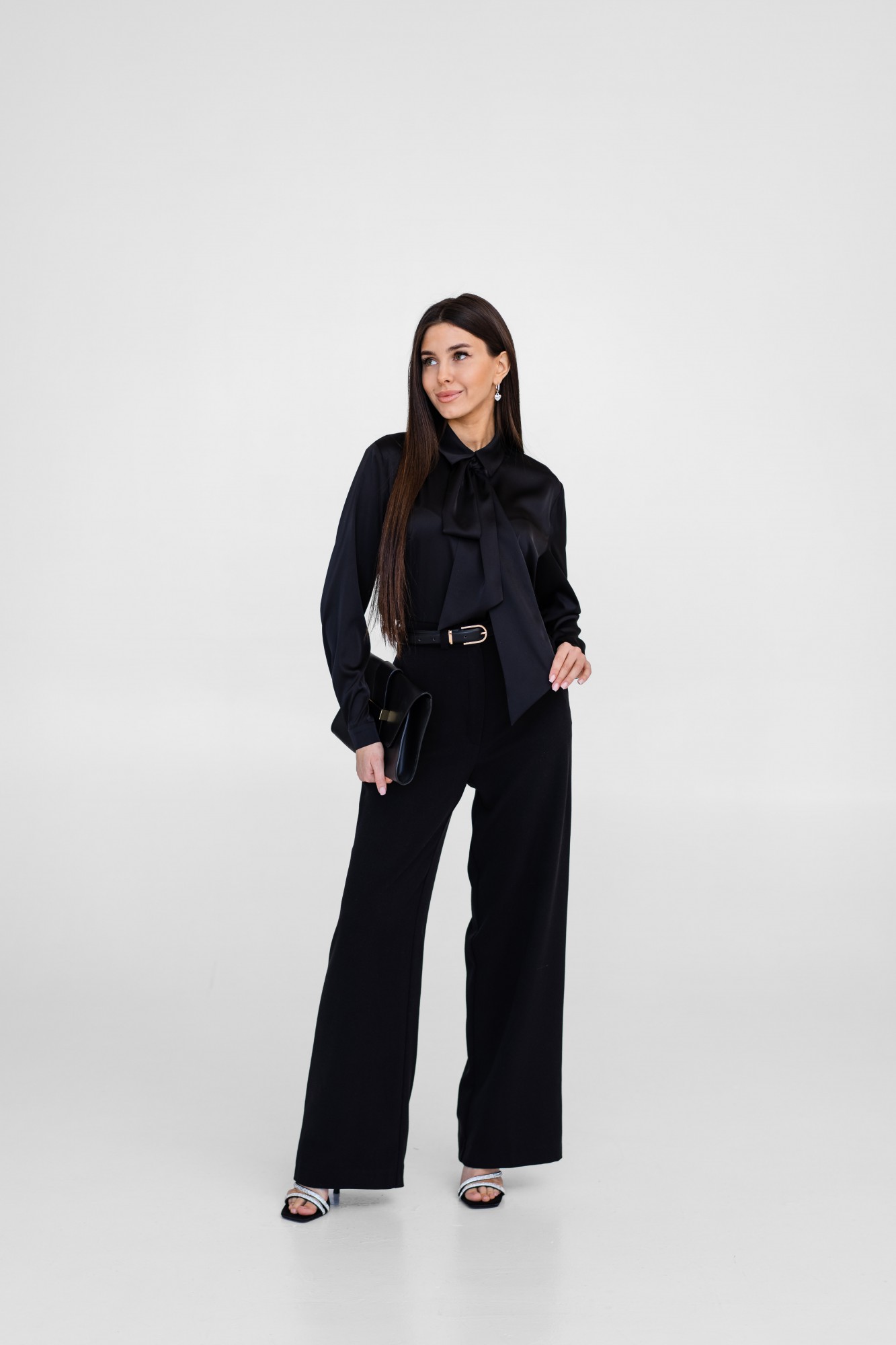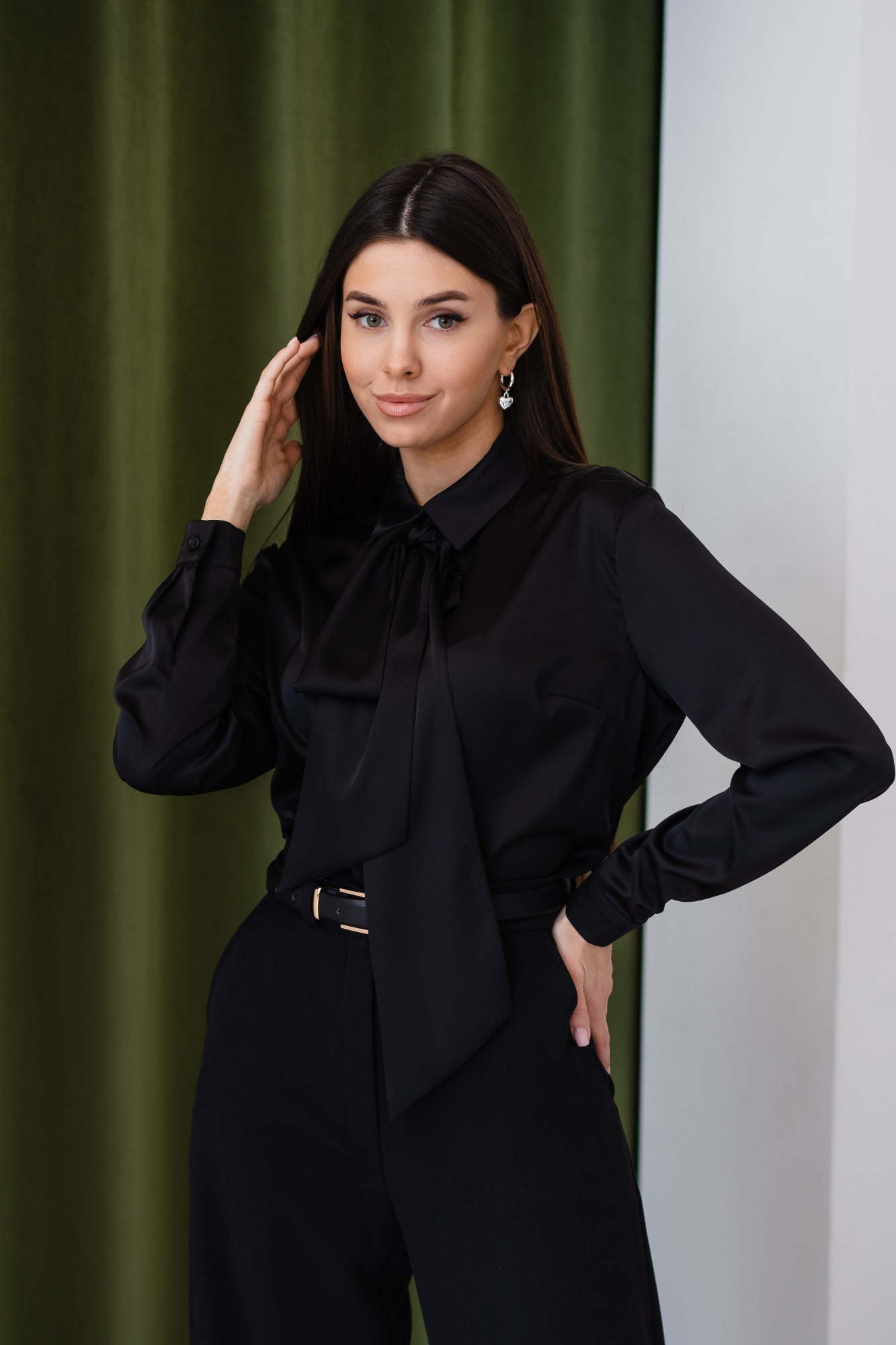 Блузка женская из искусственного шелка, на горловине спереди красивый декоративный элемент, который превращается в изящный бант или галстук (по вашему желанию и настроению, его можно снять). Рукав длинный с манжетой, длина изделия примерно до середины ягодиц. Очень женственная и стильная модель блузки будет отличным выбором для делового стиля, праздничного наряда или романтичного образа.